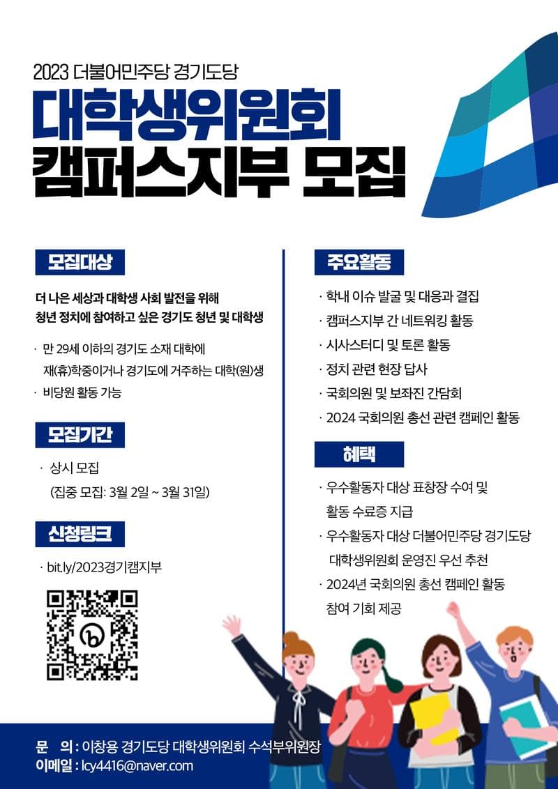 [2023년 더불어민주당 경기도당 대학생위원회 캠퍼스지부원을 모집합니다!] 더 즐거워질 대학 캠퍼스 생활, 더 나아질 우리 사회를 원한다면? 민주당 경대위와 함께 만들어봐요! 안녕하세요! 더불어민주당 경기도당 대학생위원회입니다. 경기도당 대학생위원회 캠퍼스지부는 경기도 소재 대학교에 다니거나 경기도에 거주하고 있는 대학생들이 함께 더 나은 사회를 만들고 대학생들의 목소리를 내기 위해 구성한 당 내부 동아리 형태의 조직입니다. 평소 민주당이 내세우는 가치에 공감하시거나 대학생들을 위해 목소리를 내고 활동해보겠다는 의지를 지니고 계시다면 캠퍼스지부원으로 함께해 주시면 감사하겠습니다. 모집대상 더 나은 세상과 대학생 사회 발전을 위해 청년 정치에 참여하고 싶은 경기도 청년 및 대학생 -만29세 이하의 경기도 소재 대학에 재(휴)학 중이거나, 경기도에 거주하는 대학(원)생 -비당원 활동 가능 모집기간 -상시모집 -집중모집: 3.2(목)\~3.31(금) 주요활동 -학내 이슈 대응 및 결집 -캠퍼스지부 간 네트워킹 활동 -시사 스터디 및 토론 활동 -정치 관련 현장 답사 -2024년 국회의원 선거 관련 캠페인 활동 혜택 -우수활동자 대상 표창장 수여 및 활동 수료증 지급 -우수활동자 대상 더불어민주당 경기도당 대학생위원회 운영진 우선 추천 -2024년 국회의원 선거 캠페인 활동 참여 기회 제공 문의 경기도당 대학생위원회 수석부위원장 이창용 010-2472-0952 lcy4416@naver.com 신청링크 bit.ly/2023경기캠지부
