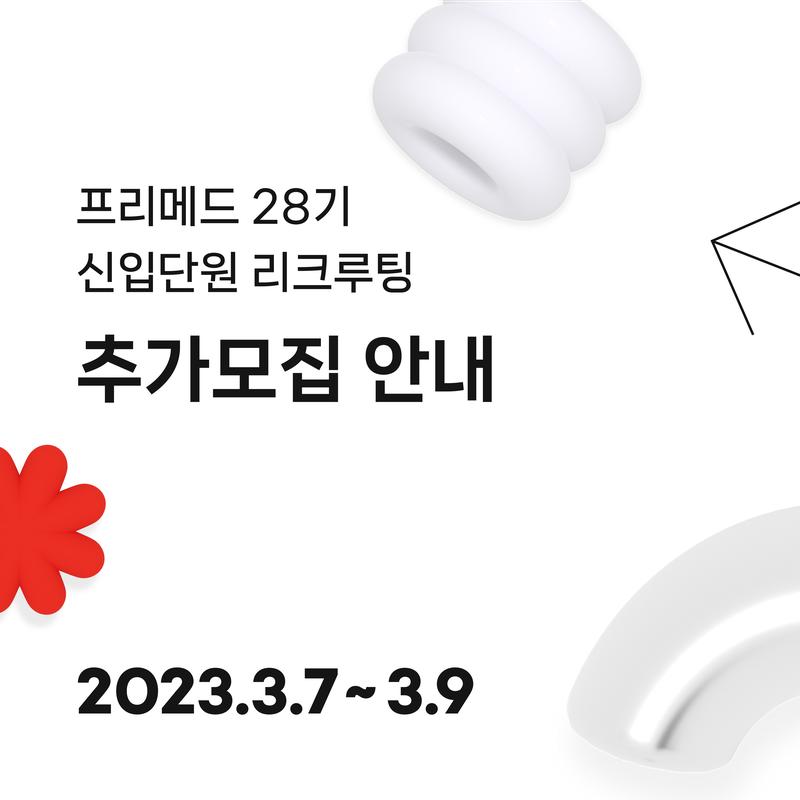 지난 2023년 3월 5일 일요일에 마감 된 28기 신입단원 모집, 혹시 아쉽게 놓치셨나요? 프리메드에서 아래의 팀을 대상으로 신입단원 추가 모집을 진행합니다! 🗓추가 모집 기간 2023년 3월 7일 화요일 \~ 2023년 3월 9일 목요일 오전 11시 59분 💎경영지원본부 인사조직팀 💎보건교육사업본부 아동교육팀 💎보건교육사업본부 청소년교육팀 💎브랜드마케팅본부 홍보디자인팀 🚩추가 모집 팀 소개 및 지원서 작성 링크🚩 https://linktr.ee/Freemed 프리메드에서는 열정을 가지고 도전하고자 하는 여러분의 지원을 기다리고 있습니다. 세상을 좀 더 나은 곳으로 변화시키기 위한 걸음에 동참하고자 하신다면 프리메드 28기에 도전해보세요!👏