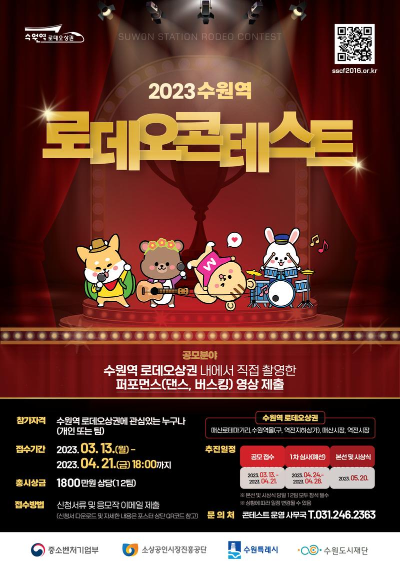 ● 참가자격 수원역 로데오 상권에 관심이 있는 누구나 *지역 및 나이 제한이 없습니다. ● 공모부문 - 주제 : 수원역 로데오 상권 1. 댄스 부문 : 수원역 로데오 상권을 배경으로 5분 이내 자유주제(힙합, 비보잉, 팝핀, 락킹, K-POP 등) 온·오프라인 댄스 영상 공모 2. 버스킹 부문 : 수원역 로데오 상권을 배경으로 5분 이내 자유주제(커버곡, 창작곡, 연주 등) 온·오프라인 버스킹 영상 공모 ※2개 부문(댄스, 버스킹) 부문 간 교차 응모가 가능, 1인이 동일 부문에 여러 작품 응모 시 최초 접수된 작품으로 심사 ● 지원방법 수원도시재단 홈페이지(수원도시재단-지원사업-지원사업공고) (https://sscf2016.or.kr/entry_view.do?mn_key=02020000&ACV_CNT_BOARD_NUM=202303061406180667#)참가신청서 및 동의서 다운로드 참가자 본인 계정 유튜브에 해시태그와 함께 업로드(공개설정 필수) 참가신청서에 업로드한 URL을 첨부하여 (ggo323@hopenest.kr) 이메일에 접수 ● 기간 및 일정 - 접수기간 : 2023.03.13.(월) \~ 04.21.(금) 18:00까지 - 시상식 : 2023.05.20.(토) 예정 / 장소 : 수원역 문화광장 ※ 모든 수상자는 특별한 사유가 없을 경우 반드시 시상식에 참여해야 함. ● 시상 내역 총 시상금 18,000,000원 상당 / 총 수상 인원 12인(팀) - 대상 (부문별 1명(팀)) : 500만 원(아이패드 10세대 wifi + 온누리상품권) - 최우수상 (부문별 1명(팀)) : 200만 원(애플워치SE 44mm GPS + 온누리상품권) - 우수상(부문별 1명(팀)) : 온누리상품권 100만 원 - 장려상(부문별 3명(팀)) : 온누리상품권 각 30만 원 ● 관련 링크 수원도시재단 링크: https://sscf2016.or.kr/entry_view.do?mn_key=02020000&ACV_CNT_BOARD_NUM=202303061406180667) ※자세한 유의사항은 수원도시재단 홈페이지 내 공고문 확인 부탁드립니다. ● 문의 사항 - 수원역 로데오 콘테스트 운영사무국 Tel. 031-246-2363 ※ 운영시간 : 평일 오전 9시 30분 \~ 오후 6시 (점심시간 : 12:00 \~ 13:30)