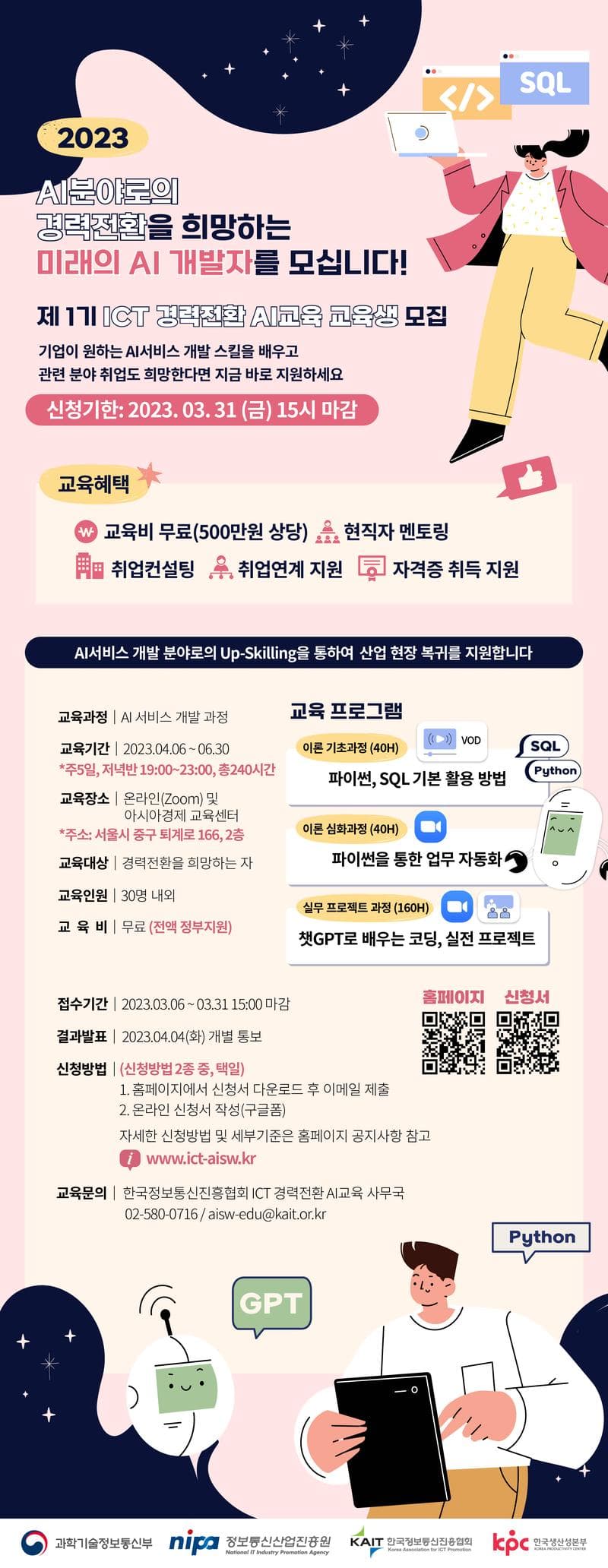 ● 문의 한국정보통신진흥협회 ICT 경력전환 AI교육 사무국 aisw-edu@kait.or.kr / 02-580-0716