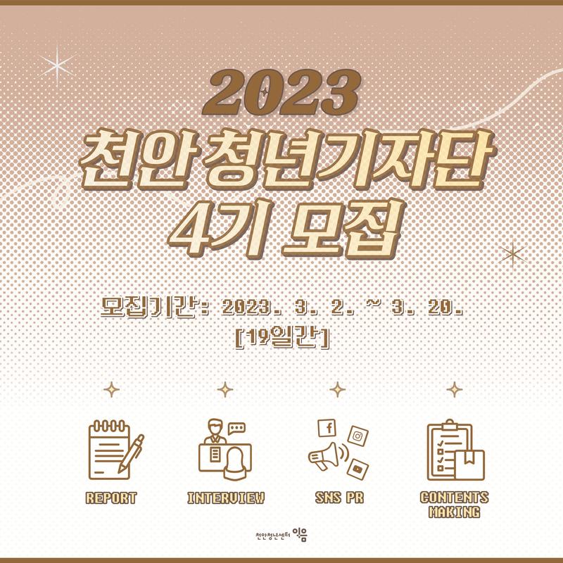 [천안 청년기자단 4기 모집📣] 2023년, 천안청년센터와 함께할 청년기자단을 모집합니다! 다양한 청년들을 만나고, 역량 성장을 도모할 청년들의 많은 지원 부탁드립니다 :)