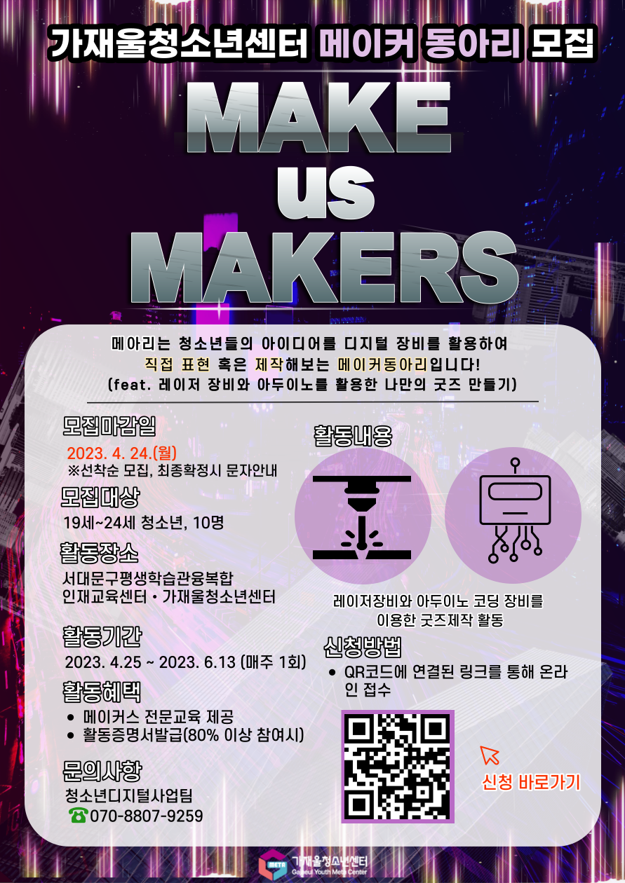 [모집개요] 📌 모집마감일: 4.24.(월) 📌 모집인원: 10명 📌 모집대상: 만 19 세 \~ 24세 청소년 📌 활동기간: 2023. 4. \~ 2023. 11. ※ 현재 가재울청소년센터가 9월 개관 예정인 관계로 서대문구 평생학습관 융복합인재교육센터에서 진행(평일 16:00\~ 18:00)합니다. 개관후 개강하는 프로그램은 가재울청소년센터에서 진행(토요일 14:00\~16:00)됩니다! 📌 활동혜택 🔎 메이커스 전문교육 제공 🔎 80%이상 참여 청소년 활동증명서 발급 📌 문의사항: 청소년디지털사업팀 T.070-8807-9259