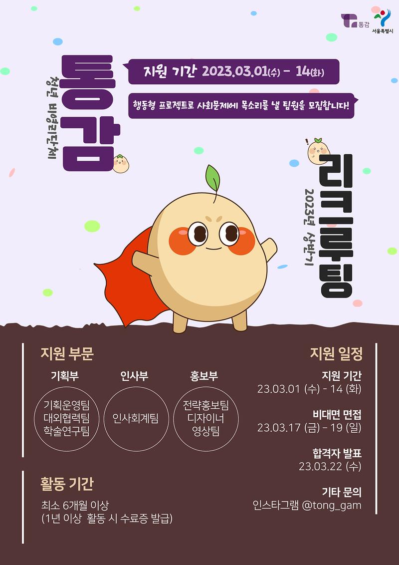 [행동형 프로젝트] 서울시 청년 비영리단체 통감의 새로운 팀원을 모집합니다! 안녕하세요, 경쾌한 행동형 프로젝트를 통해 사회 문제에 목소리를 내는 청년 비영리단체 통감입니다. 통감에서는 2023년 새로운 프로젝트를 함께 만들어갈 팀원을 모집합니다! 💡이 중 하나라도 해당한다면 지금 바로 지원하세요! ✅나는 평소 사회 문제에 관심이 많으며 나만의 의견을 가지고 있다 ✅시키는 일만 하는 것이 아니라 주체적으로 프로젝트를 이끌고 싶다 ✅사기업과 유사한 체계적인 운영 시스템 속에서 원하는 직종에 관한 업무 경험을 쌓고 싶다 ✅관심 분야가 비슷한 또래 청년들과 재미있는 추억을 만들고 싶다 🔻[클릭!] 통감 A to Z & 지원서 다운로드 🔻 https://wearetonggam.notion.site/wearetonggam/e15c62eee5484cdaaca43dbf06ece7a6 1. 모집 개요 📍모집 분야 기획부(기획운영팀/ 학술연구팀/ 대외협력팀) 인사부(인사회계팀) 홍보부(전략홍보팀/영상팀/디자이너) *총 7개 부문 모집 📍활동 내용 2023년 통감은 청년 아르바이트 속 노동문제에 관한 프로젝트 <알바 HERE로>를 진행할 예정입니다 ! -기획운영팀 : 세부 행사의 전반적인 기획과 진행 / 예산안 및 기획서 작성 -학술연구팀 : 프로젝트 주제 전문지식 조사 / 아이디에이션 주관 / 설문 조사 제작 / 지식 전달 콘텐츠 제작 -대외협력팀 : 프로젝트 관련 외부 협업 담당 / 프로젝트 관련 섭외 업무 총괄 / 장소 대관 -인사회계팀 : 인사 문화 관리 / 각종 내부 행사 기획 / 리크루팅 업무 / 예산 관리 / 서포터즈 관리 -전략홍보팀 : 홍보 콘텐츠 제작 / 통감 SNS 운영 / 서포터즈 모집 홍보 / 자체 콘텐츠 개발 / 웹툰 기획 및 콘티 제작 / 블로그 인터뷰 콘텐츠 진행 -영상팀 : 숏폼 제작 / 시민 참여 영상 기획 및 촬영 / 통감 자체 콘텐츠 기획 / 통감 유튜브 채널 운영 -디자이너 : 포스터 디자인 / 행사 물품 디자인 / 캐릭터 디자인 📍자격 요건 사회문제에 관심이 있는 2030 청년이라면 누구나! 📍리크루팅 일정 지원기간 : 2023.03.01(수) \~ 2023.03.14(화) 면접 기간 : 2023.03.17(금) \~ 2022.03.19(일) 합격자 발표 : 2022.03.22(수) O.T : 2022.03.24(금) 19:00 *필참 📍모집 인원 0명 (팀별 상이) 📍지원 방법 노션 페이지에 있는 지원서를 작성한다. 통감 네이버 메일 계정(tonggam_pr@naver.com)으로 14일(화) 자정 전까지 메일을 보내면 완료! 📍정기 활동 매주 금요일 19:00 총회 혹은 팀회의 진행 -총회 : 통감자 전체가 모이는 회의, 오프라인 -팀회의 : 팀별 회의, 오프라인과 온라인 병행 📍활동 장소 서울 소재 대학 강의실이나 장소 대관 📍활동 기간 최소 6개월 (1년 활동 시 수료증 발급) 📍회비 한 학기에 35,000원 📍문의 인스타그램 DM @tong_gam 카카오톡 채널 @통감 리크루팅 담당자 : 010-4858-7713 대표 : 010-7610-6228 부대표 : 010-5880-9864 2. 통감은 어떤 단체인가요? 📍통감의 비전 통감은 사회 문제를 이야기하는 공론장을 만들기 위해 주도적으로 경쾌한 온오프라인 프로젝트를 선보이고 청년들이 함께 토의하는 공론의 장을 형성하며 사회 문제 관련 프로젝트에 대한 콘텐츠를 제작함으로써 청년들의 목소리를 경쾌하게 사회에 전달하고자 합니다. 📍지원 -서울특별시 비영리민간단체 공익활동 지원사업 선정 (2017-2022) -아름다운재단 지원사업 선정 (2019-2020) -아름다운 재단 변화의 스폰서 지원 단체 선정 (2017) 📍PROJECT -청년 아르바이트 속 노동문제를 다루는 “알바 HERE로” (2023, 진행 예정) -건강한 청년 정신건강을 위하고 원하는 會 “청정위원회” (2022) -그린 워싱 인식개선 프로젝트 “플_엑스:Plastic X” (2021) -청년 1인 가구 주거환경 개선 프로젝트 “살_만한家” (2020) -플라스틱 빨대 퇴출 프로젝트 “빨_대혁명” (2019) 📍통감 SNS 인스타그램 https://instagram.com/tong_gam?igshid=YmMyMTA2M2Y= 블로그 https://m.blog.naver.com/tong_gam 유튜브 https://www.youtube.com/channel/UCP8gjV9SidNO3ykBH4eOjcg 리크루팅과 통감에 관한 자세한 내용은 본문에 있는 노션 링크를 통해 확인해주세요. 통감과 함께 다양하고 경쾌한 방식으로 사회에 목소리를 내고 싶은 분들은 망설이지 말고, 지금 바로 지원하세요❗️
