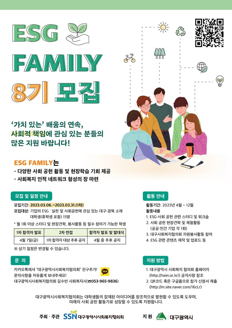 ※ 활동 안내 -활동 기간: 2023년 4월 \~ 12월 -활동 내용 1.ESG 및 사회 공헌 활동 관련 스터디 ex. 사회공헌 아이디어 선발전 공모 2. 사회 공헌 현장견학 및 체험활동(공공·민간 기업 각 1회) 3. ESG 워크숍 4. 대구사회복지협의회 자원봉사활동 참여 5. ESG 패밀리 홍보 콘텐츠 제작 및 업로드 등 자유로운 활동 등