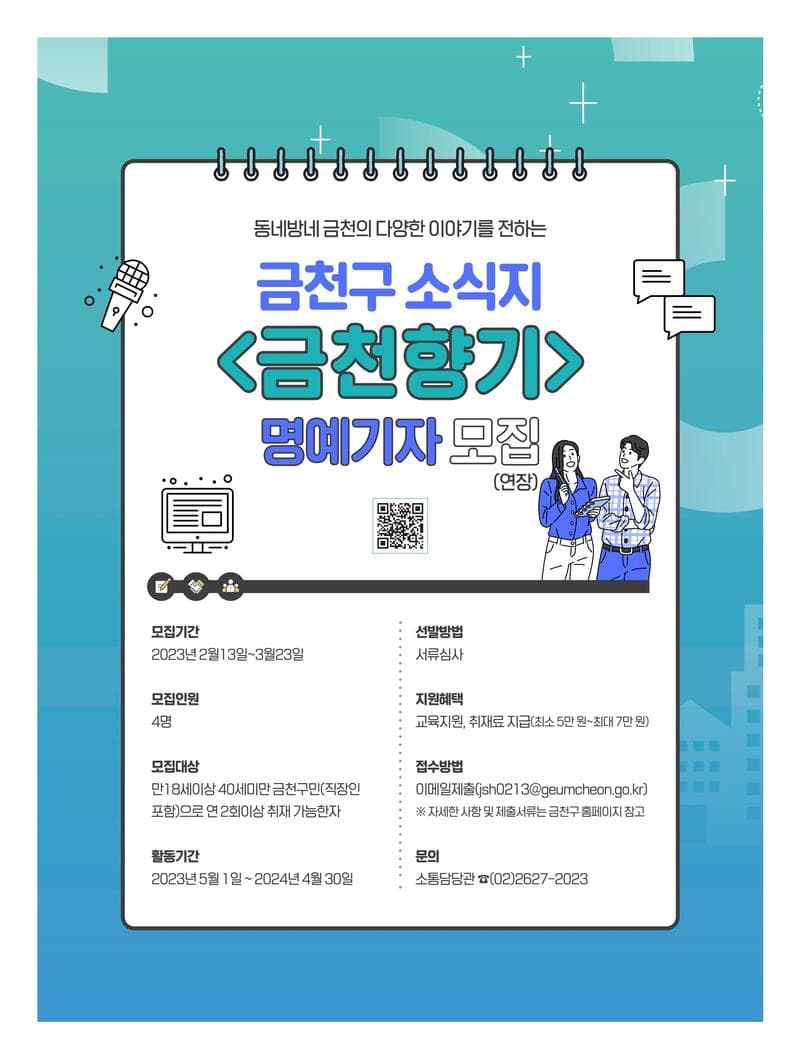 - 운영목적 : 구정 및 생활정보를 주민에게 전달하기 위한 현장체감형 기사 취재 및 제공 - 모집기간 : 2월 13일 \~ 3월 23일 - 모집인원 : 4명 - 모집대상 : 만18세 이상 40세 미만 금천구민(금천구 소재 직장인 포함)으로 연 2회 이상 취재 가능한 자 - 활동기간 : 2023년 5월 1일 \~ 2024년 4월 30일(연임 가능) - 활동내용 : 금천구 내 행사·축제·사업참여 현장취재, 지역미담사례 발굴 및 주민의 다양한 의견 수렴 등 - 선발방법 : 서류심사 - 지원혜택 : 교육지원, 취재료 지급(최소5만원\~최대7만원) - 접수방법 : 이메일접수(jsh0213@geumcheon.go.kr) ※ 자세한 사항 및 금천구 블로그(blog.naver.com/geumcheon1/223014301055) 참고 - 문의 : 소통담당관 02-2627-2023