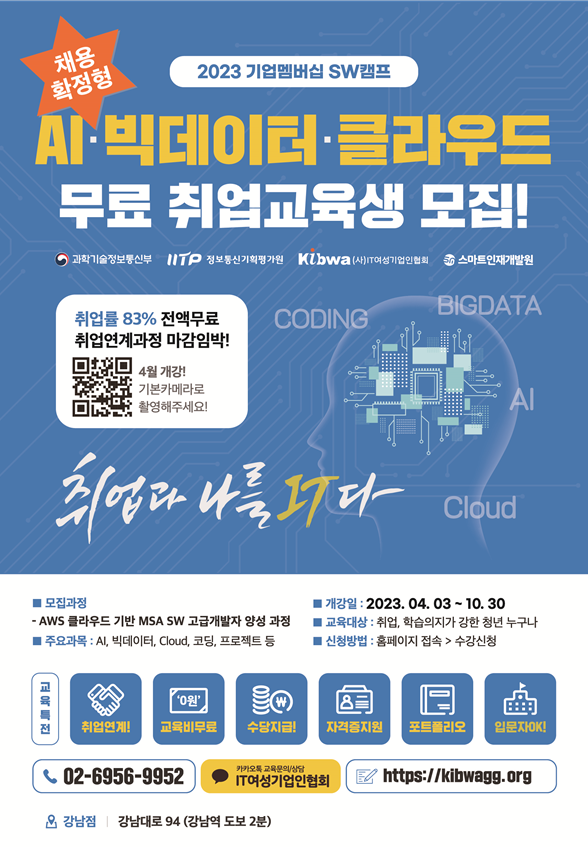 ● 주최/주관 - 과학기술정보통신부, 정보통신기획평가원, (사)IT여성기업인협회, (사)스마트인재개발원 ● 지원자격 - 취업을 희망하는 의지가 있는 청년 누구나 가능 ● 기간 및 일정 - 신청서 접수 : 2023년 3월 20일 (월)까지 - 개 강 일: 2023년 3월 20일(예정) - 교육기간: 2023년 3월 20일 \~ 10월 30일(총 1280시간) * 기업연계 인턴십 1개월 포함