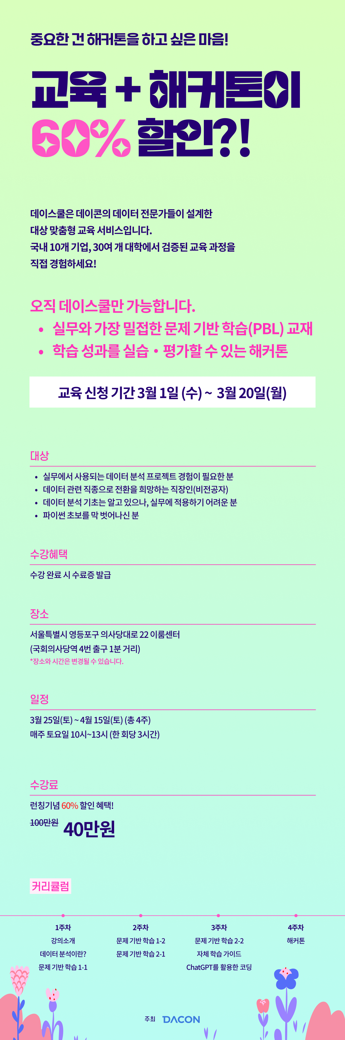데이스쿨은 데이콘의 데이터 전문가들이 설계한 대상 맞춤형 교육 서비스입니다. 국내 10개 기업, 30여 개 대학에서 검증된 교육 과정을 직접 경험하세요!