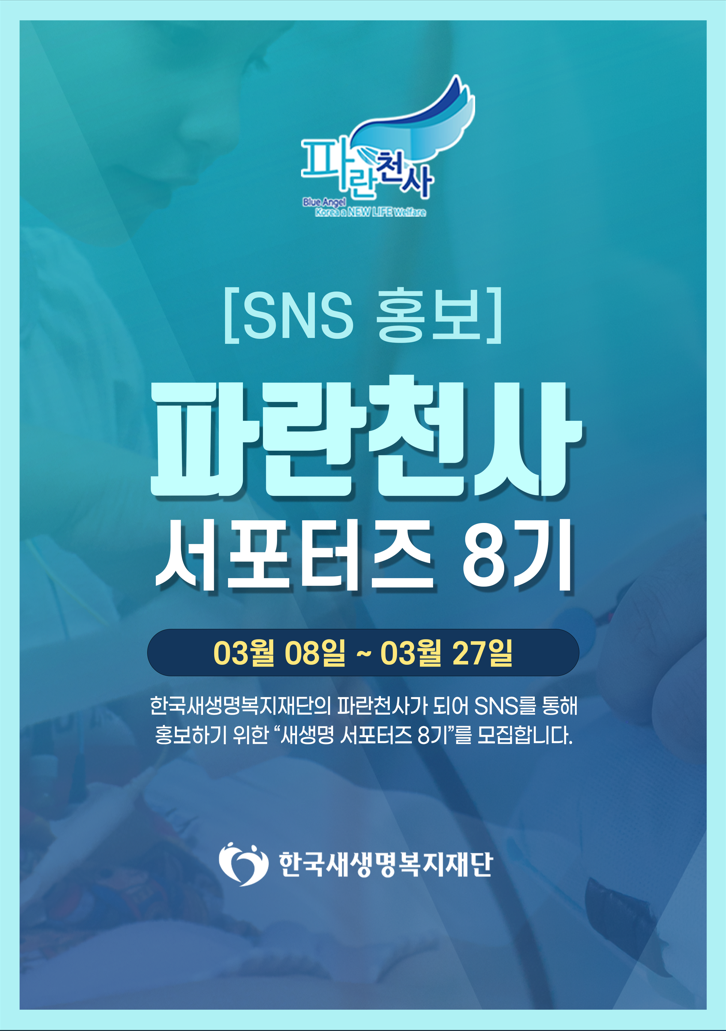 파란천사 SNS 서포터즈 8기 모집 한국새생명복지재단은 나눔과 봉사를 통해 어렵고 힘든 이웃들에게 사랑을 실천하는 사회복지비영리기관입니다. 한국새생명복지재단의 파란천사가 되어 SNS를 통해 홍보하기 위한 “새생명 서포터즈 8기”를 모집합니다.