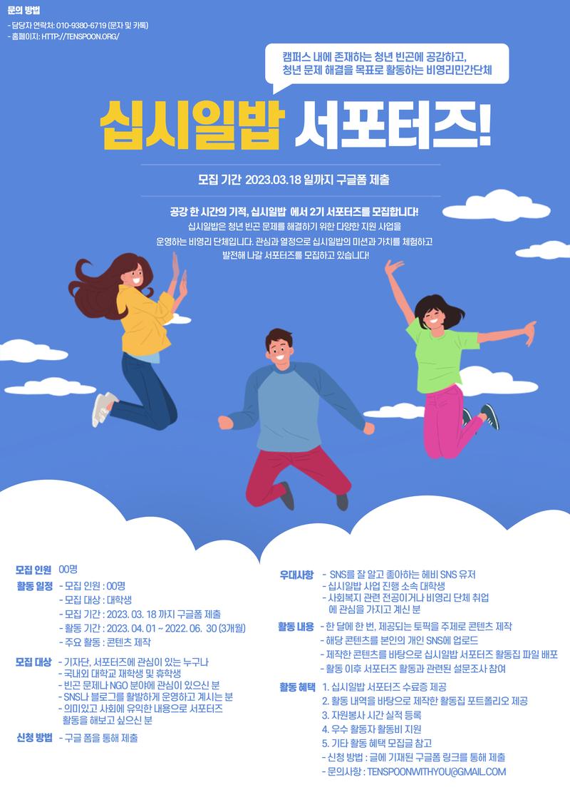 평소 청년 빈곤에 관심이 많았다면, 청년 빈곤이나 비영리 단체에 대해 더 자세히 알고 싶다면 여기 여기 모여라〰️ 공강 한 시간의 기적, 십시일밥🥄🍚🥢에서 3기 서포터즈를 모집합니다! 십시일밥은 청년 빈곤 문제를 해결하기 위한 다양한 지원 사업을 운영하는 비영리 단체입니다. 이전 활동 경험과 능력에 상관없이, 관심과 열정으로 십시일밥의 미션과 가치를 체험하고 발전해 나갈 서포터즈를 모집하고 있습니다.
