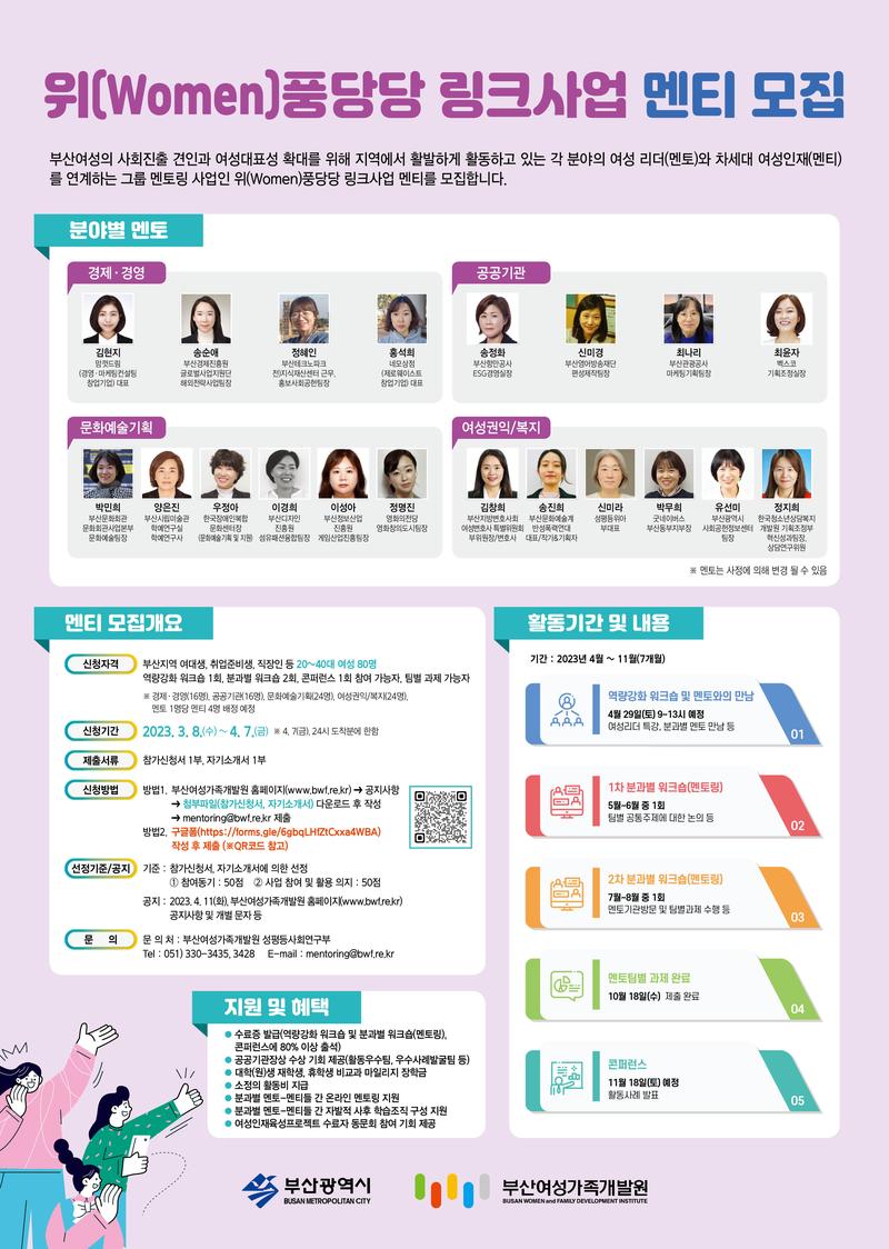 8. 문의 : 부산여성가족개발원 성평등사회연구부(☎051-330-3435\, 3428\, mentoring@bwf.re.kr)