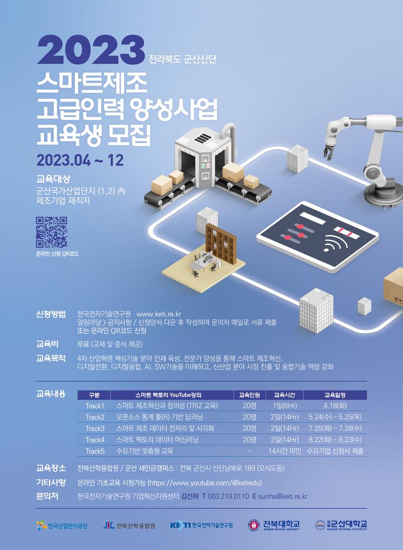 가. 교 육 명 : 2023년 스마트제조 고급인력 양성교육 나. 교육목표 : 4차 산업혁명 핵심기술 분야 인재 육성, 전문가 양성을 통해 스마트 제조혁신, 디지털전환, 디지털융합, AI, SW기술을 이해하고, 신산업 분야 시장 진출 및 융합기술 역량 강화 다. 교육대상 : 군산국가산업단지(1, 2) 입주기업 재직자 라. 교육기간 : 2023. 04. \~ 2023. 12. 마. 교육장소 : 전북산학융합원 / 군산 새만금캠퍼스 (별도 안내) 바. 신청방법 : 한국전자기술연구원 (www.keti.re.kr) 공지사항 확인 또는 온라인 QR코드 신청