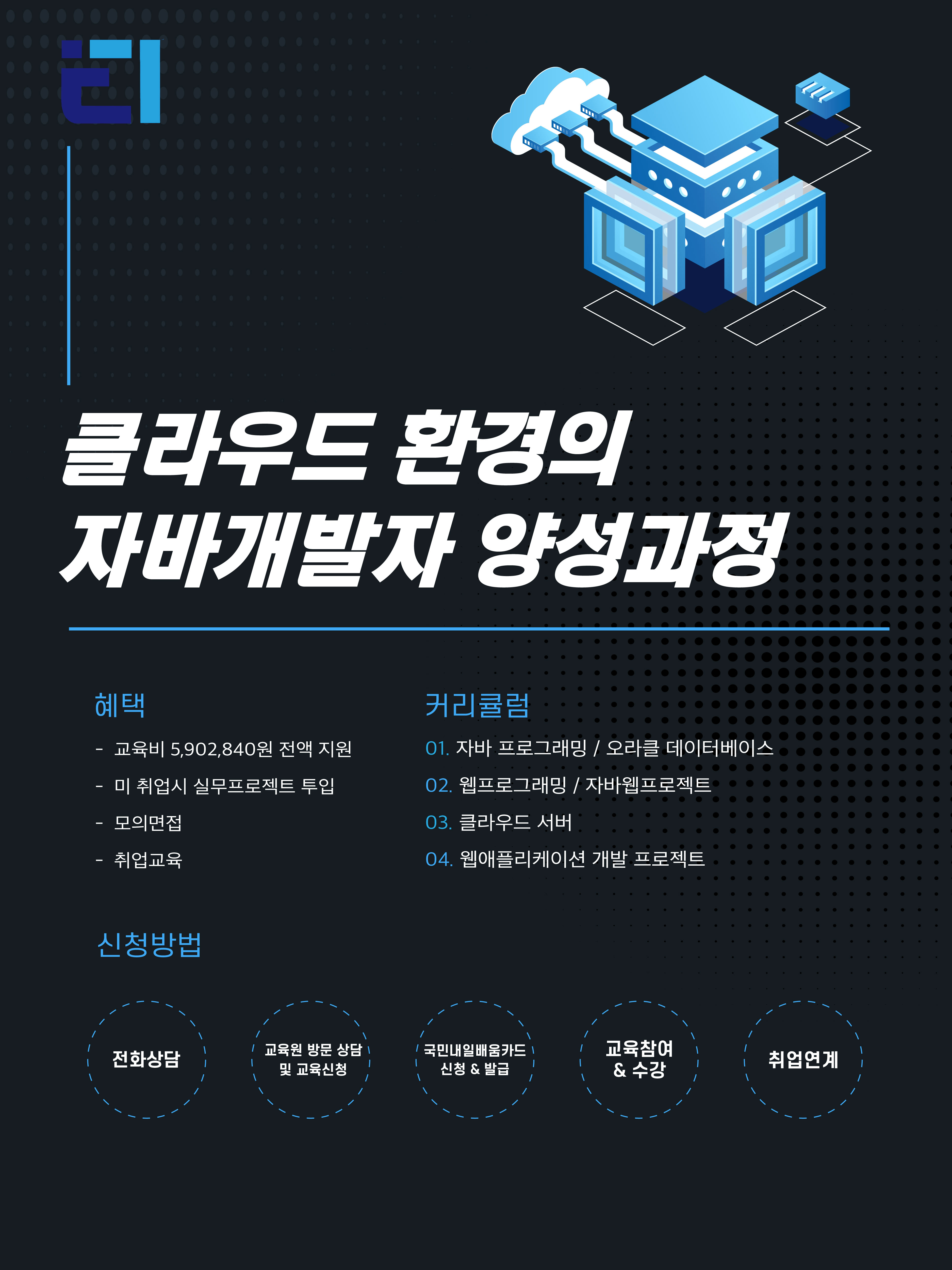 - 교육시간 : 09:30\~18:20 / 자율스터디 18:30\~22:00 (5.5개월)