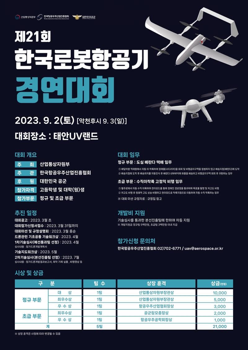 □ 대회 개요 ○ 명 칭 : 제21회 한국로봇항공기(드론) 경연대회 ○ 주 최 : 산업통상자원부 ○ 주 관 : 한국항공우주산업진흥협회 ○ 후 원 : 대한민국 공군 ○ 대회일시 : 2023. 9. 2(토), 09:00∼17:00 【악천후시 9. 3(일)】 ○ 대회장소 : 태안UV랜드 ○ 참가자격 : 고등학생 및 대학(원)생 ○ 참가부문 : 정규 및 초급 부문