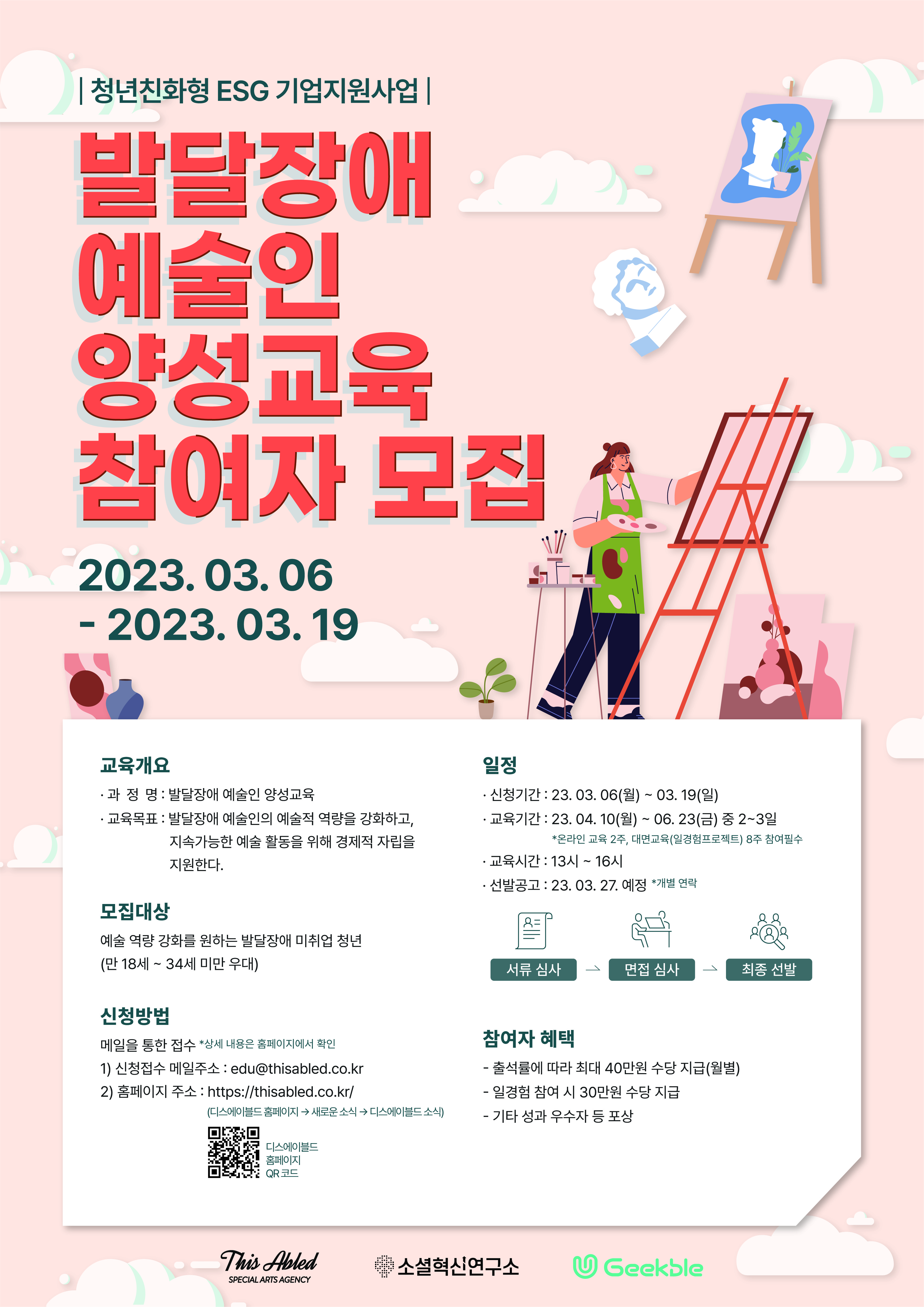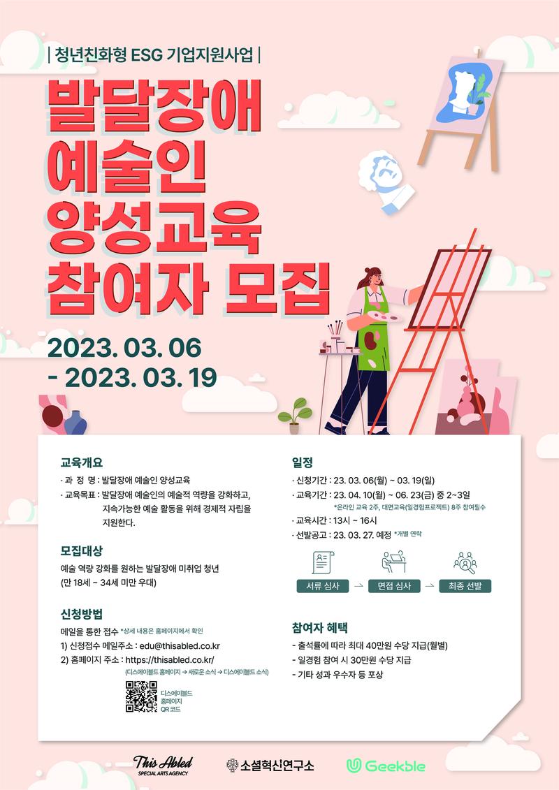 - 교육목표 : 발달장애 예술인의 예술적 역량을 강화하고\, 지속가능한 예술 활동을 위해 경제적 자립을 지원