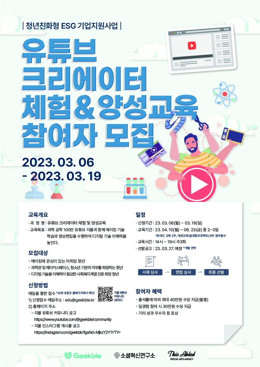 [신청 방법] - 메일을 통한 접수 ※ 상세 내용 홈페이지에서 확인 1) 신청접수 메일 주소 : edu@geekble.kr 2) 홈페이지 주소 : - 긱블 유튜브 커뮤니티 공고 : https://www.youtube.com/community - 긱블 인스타그램 게시물 공고 : https://instagram.com/geekble
