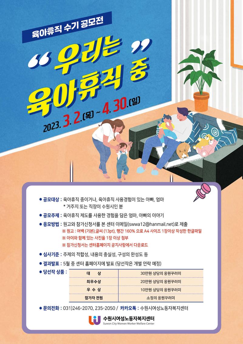 육아휴직 수기공모전 “우리는 육아휴직 중” ●모집기간: 2023년 3월 2일(목) \~ 4월 30일(일) ●공모대상: 육아휴직 중이거나, 육아휴직 사용경험이 있는 아빠, 엄마 ※거주지 또는 직장이 수원시인 분 ●공모주제: 육아휴직 제도를 사용한 경험을 담은 엄마, 아빠의 이야기 ●응모방법: 원고와 사진, 참가신청서를 이메일 ( swwa12@daum.net) 로 제출 ※원고: 여백 (기본),글씨 (13pt), 행간 160% 으로 A4 사이즈 1장이상 작성한 한글파일 ※아이와 함께 있는 사진을 1장 이상 첨부 ※참가신청서는 센터홈페이지 (swwa.or.kr) 공지사항에서 다운로드 ●심사기준: 주제의 적합성, 내용의 충실성, 구성의 완성도 등 ●결과발표: 5월 중 센터 홈페이지에 발표 (당선작은 개별 연락예정) ●당선작 상품: 대상 - 30만원 상당의 응원꾸러미 최우수상 - 20만원 상당의 응원꾸러미 우수상 - 10만원 상당의 응원꾸러미 참가자 전원 - 소정의 응원꾸러미 ●전화 문의 : 031) 246-2070, 235 – 2050 ●카카오톡 문의: ‘수원시여성노동자복지센터’