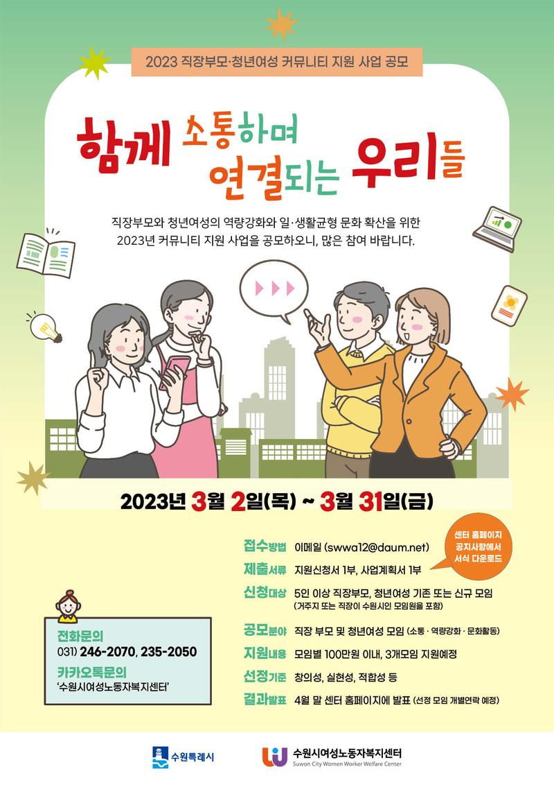 [수원시여성노동자복지센터] 2023 직장부모·청년여성 커뮤니티 지원 사업 공모 "함께 소통하며 연결되는 우리들" - 직장부모와 청년여성의 역량강화와 일·생활균형 문화 확산을 위한 2023년 커뮤니티 지원 사업을 공모하오니\, 많은 참여 바랍니다. ●공모기간: 2023년 3월 2일(목) \~ 3월 31일(금) ●접수방법: 이메일 (swwa12@daum.net) ●제출서류: 지원신청서 1부, 사업계획서 1부 ※센터 홈페이지 (swwa.or.kr) 공지사항에서 서식 다운로드 ●신청대상: 5인 이상 직장부모, 청년여성 기존 또는 신규 모임 (거주지 또는 직장이 수원시인 모임원을 포함) ●공모분야: 직장 부모 및 청년여성 모임 (소통 · 역량강화 · 문화활동) ●지원내용: 모임별 100만원 이내, 3개모임 지원예정 ●선정기준: 창의성, 실현성, 적합성 등 ●결과발표: 4월 말 센터 홈페이지에 발표 (선정 모임 개별연락 예정) ●전화문의 : 031) 246-2070,235-2050 ●카카오톡문의: ‘수원시여성노동자복지센터’