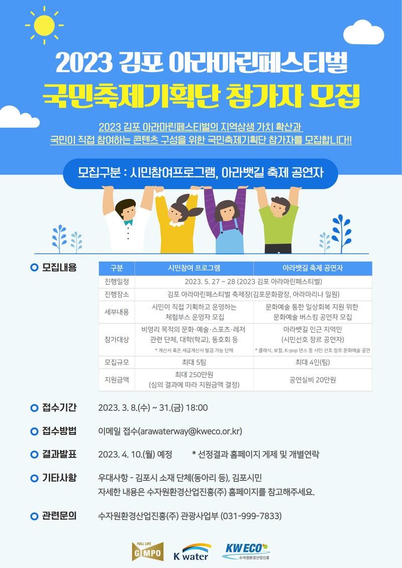 ※ 모집목적 : 2023 김포 아라마린페스티벌의 지역상생 가치 확산과 더 풍성한 콘텐츠 구성을 위한 참가자 모집