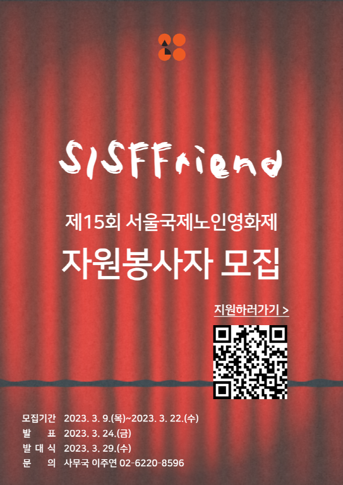 ■ 모집기간 : 2023년 3월 9일(목) \~ 3월 22일(수) 자정까지 ■ 활동기간 : 5/11(목) \~ 5/15(월), 5일간 * 활동팀에 따라 활동기간이 변동될 수 있으며 일부 인원에 한하여 조기 활동이 요구될 수 있습니다. * 홍보팀, 영상팀, 글로벌팀의 경우 사전 활동이 진행됩니다. ■ 활동장소 : 서울노인복지센터(지하철 3호선 안국역 5번출구), 대한극장 ■ 모집대상: 영화를 좋아하고 서울국제노인영화제 자원봉사 활동에 적극 참여 가능한 남녀노소 누구나 참여 가능합니다 ■ 지원방법 : 구글폼 작성 후 제출 > https://forms.gle/XjYKobCYWuVWi7tB9 ■ 선발과정 ① 발표 : 3월 24일(금), 홈페이지 공고 및 개별 연락 ② 자원봉사자 발대식 및 교육 : 3월 29일(수) ? 발대식 및 상영작 감상, 전체교육실시 예정. * 상기 일정은 사무국 사정에 따라 추후 변경 가능하며, 모든 공지사항은 영화제 공식 홈페이지를 통해 발표됩니다. * 자원봉사 실적 확인서 및 수업결손협조요청(공문) 가능합니다. * 활동기간 내 교통비 및 체재비는 본인이 부담해야 합니다. ■ 활동혜택 ① 활동 배지(ID카드) 제공 ② 공식 프로그램북 내 명단 기재, 영화제 굿즈 제공 ③ 영화제 기간 중 식권 제공 ④ (수업결손협조요청) 공문 발송 가능 ⑤ 활동인증서 발급 및 자원봉사 활동 시간 인정(vms) ⑥ 관객심사단 자격 ‘시스프렌드상’ 선정 참여 ■ 모집분야 (총 50명) - 일부 분야의 경우 조기 활동이 요구될 수 있습니다. : 모든 활동은 팀 별로 상이하며 사전 공지를 통해 참여 가능여부를 확인한 뒤 활동할 예정입니다. [홍보팀] - 7명 영화제 준비단계부터 현장에서의 홍보 활동을 진행하는 팀이다. 영화제 사무국에서 관리하고 있는 SNS(인스타그램, 페이스북, 카카오페이지 등)에 홍보물을 만들어 업로드하고 사전, 기간 중 뉴스레터를 제작해 발송한다. 활동 기간 중 영화제를 홍보하는 오프라인 홍보(지역사회 내 점포 대상 홍보 등)를 진행하는 활동을 진행하며 전반적인 홍보 활동을 경험할 수 있는 파트이다. * 영화제 기간 전 사전활동 진행 필수 [영상팀] - 5명 영화제 현장에서 개/폐막식 소식, 관람객, 부대행사 등 다채로운 현장을 영상으로 기록하고 실시간으로 홍보(숏츠, 스토리 공유 등)하는 활동을 담당한다. 영화제의 전반적인 현장을 영상으로 기록하고 제작해 공유하는 파트를 담당하기에 영상편집 및 촬영에 대한 역량을 우대한다. * 개인 DSLR소유, 영상편집 및 촬영 가능자 우대. * 영화제 기간 전 사전활동 진행 필수 [글로벌팀] -2명 영화제에 관심있거나 참여하는 외국인을 대상으로 안내하기 위한 홈페이지와 유튜브 게시물 번역 활동을 진행한다. 영어파트를 담당한다. * 영화제 기간 전 활동 진행(영화제 기간 활동은 선택) [운영팀] - 16명 예매, 발권 활동부터 영화제 현장에서 진행되는 다야유한 부대행사를 담당해 활동한다. 후원부스, 굿즈부스, 포토존 등 다양한 부대행사를 관람객들이 이용할 수 있도록 안내하는 파트이며 친절한 말쏨씨와 소통역량이 요구된다. 관객부터 영화제 주요 관계자들까지 만나는 활동을 하기 때문에 친절함과 돌발사항 대체능력이 중요하다. * 서비스 관련 경력이 있는 자를 우선 선발.
