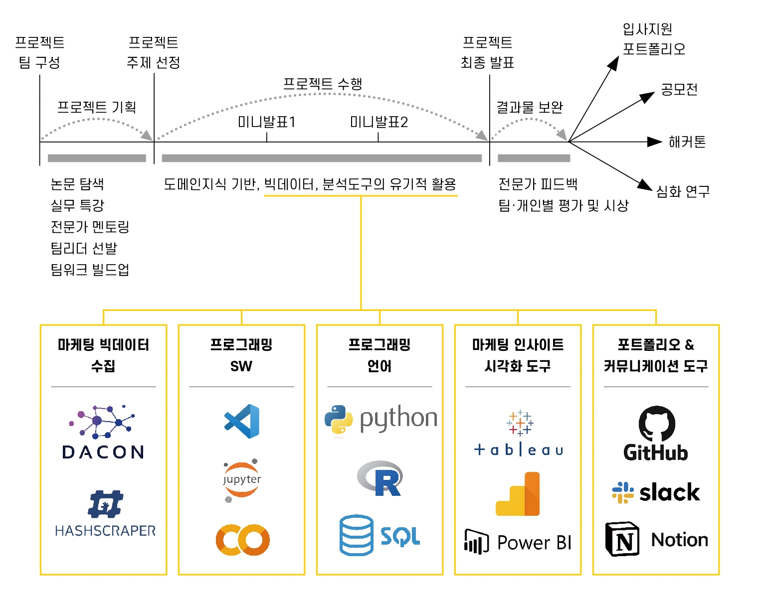 마케팅 이론뿐 아니라 Python, R 등 빅데이터 분석과 관련한 프로그래밍 언어와 태블로, Power BI 등 시각화 도구까지, 온라인 공간에서 고객과 상품이 만나는 모든 과정을 기획하고 개선할 수 있는 역량을 갖춘 훈련생들은 데이터에 기반한 통찰력으로 마케팅의 복잡함을 극복하며, 효과적인 마케팅 믹스를 기획·실행할 수 있습니다.
