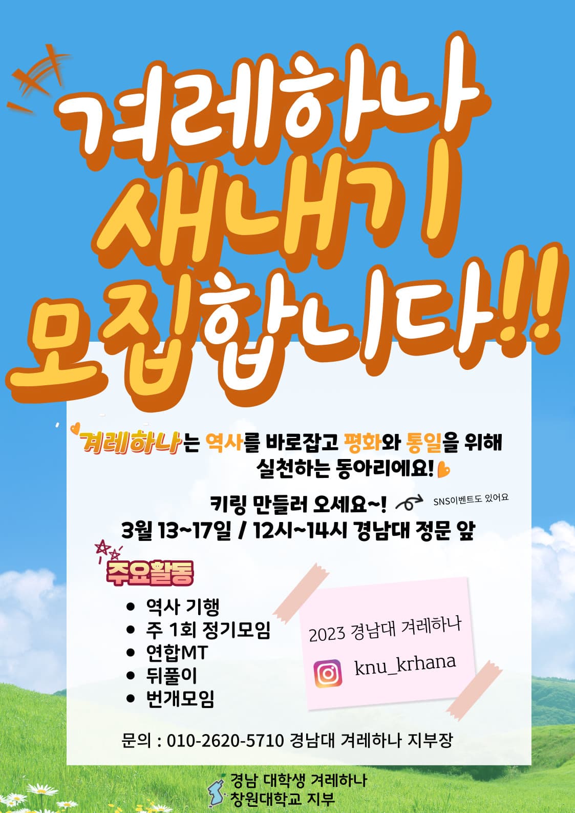 경남 겨레하나 경남대학교 지부 전화/문자 : 010-2620-5710 인스타 : knu_krhana