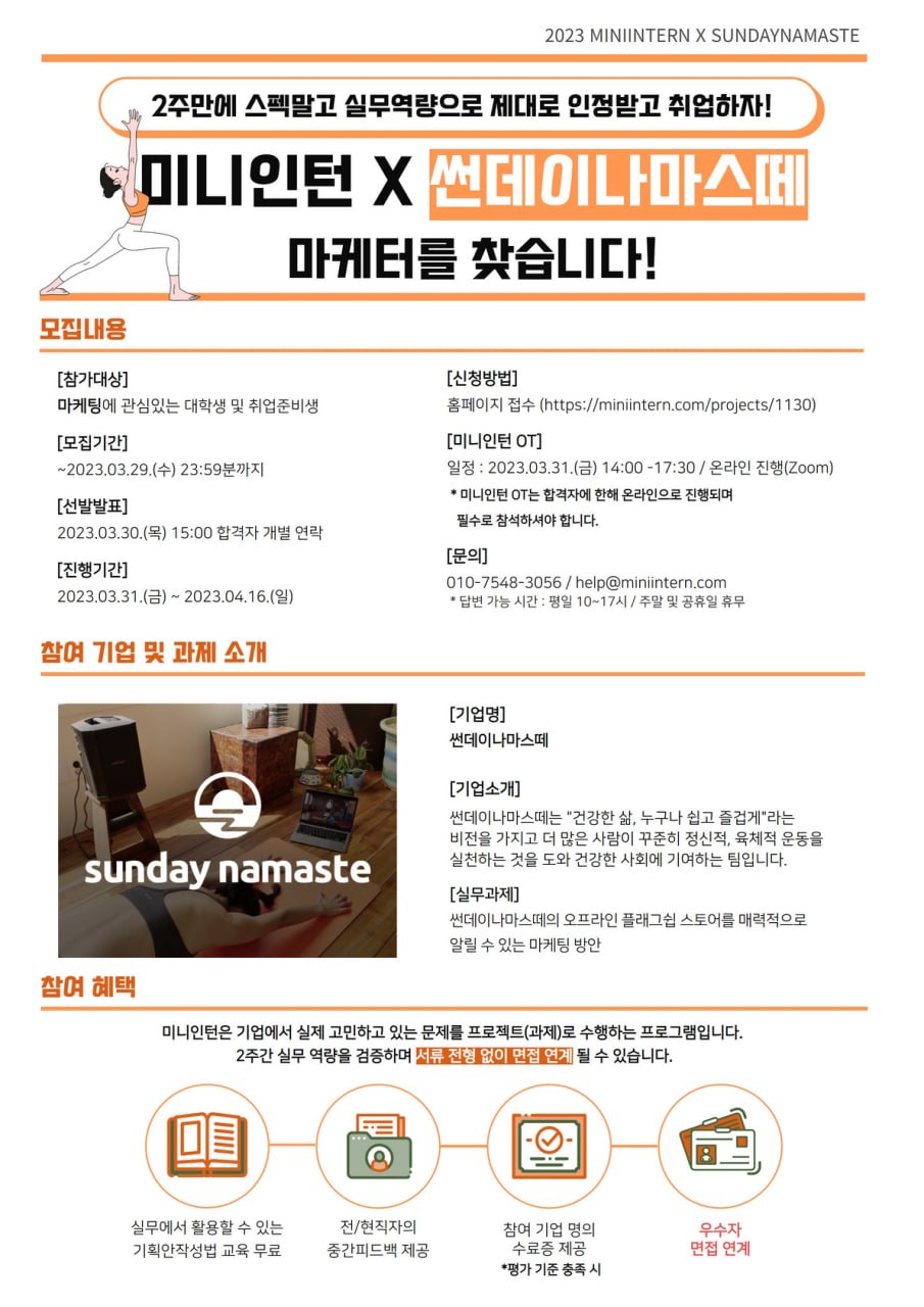 ▷미니인턴 OT 교육 내용 - 미니인턴 오리엔테이션 - 기업 소개 및 과제 안내 - 기업 담당자와의 Q&A - 기획안 작성법 강의 ▷개별 과제 소개 - 썬데이나마스떼의 오프라인 플래그쉽 스토어를 매력적으로 알릴 수 있는 마케팅 방안 *사전 온라인 OT 이후 2주간 개별 진행 ▷지원 방법 - 미니인턴 신청: https://bit.ly/3ZEJcRO ▷기타/ 문의** E-MAIL : help@miniintern.com TEL : 010- 7548- 3056 (평일 10시\~18시/ 주말 및 공휴일 휴무)