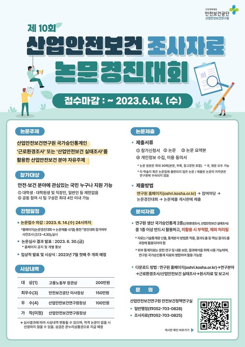 응모주제 산업안전보건연구원 국가승인통계인 '근로환경조사' 또는 '산업안전보건 실태조사'를 활용한 산업안전보건 분야 자유주제 응모자격 안전 보건 분야에 관심있는 국민 누구나 지원 가능 - 대학생/대학원생 및 직장인\, 일반인 등 제한없음 - 공동 참여 시 팀 구성은 최대 4인 이내 가능 일정 - 참가신청서/논문접수 : 2023. 06. 14.(수)까지 - 논문심사 결과 발표 : 2023. 06. 30.(금) * 홈페이지 공지 및 개별 통보 - 입상작 발표 및 시상식 : 2023년 7월 첫째 주 접수방법 홈페이지를 통한 접수 연구원 홈페이지 -> 연구분야 -> 근로환경 조사/산업안전보건 실태조사 -> 원시자료 및 보고서 시상내역 - 대상(1) : 고용노동부 장관상 / 200만원 - 최우수(3) : 안전보건공단 이사장상 / 150만원 - 우수(4) : 산업안전보건연구원장상 / 100만원 - 가작(-) : 산업안전보건연구원장상 * 심사결과에 따라 시상내역이 변동 될 수 있으며, 적격 논문이 없을 시 선정하지 않을 수 있음. (상금은 온누리상품권으로 지급 예정) 문의 산업안전보건연구원 안전보건정책연구실 - 일반행정(052-703-0828) & 조사자료(052-703-0825)