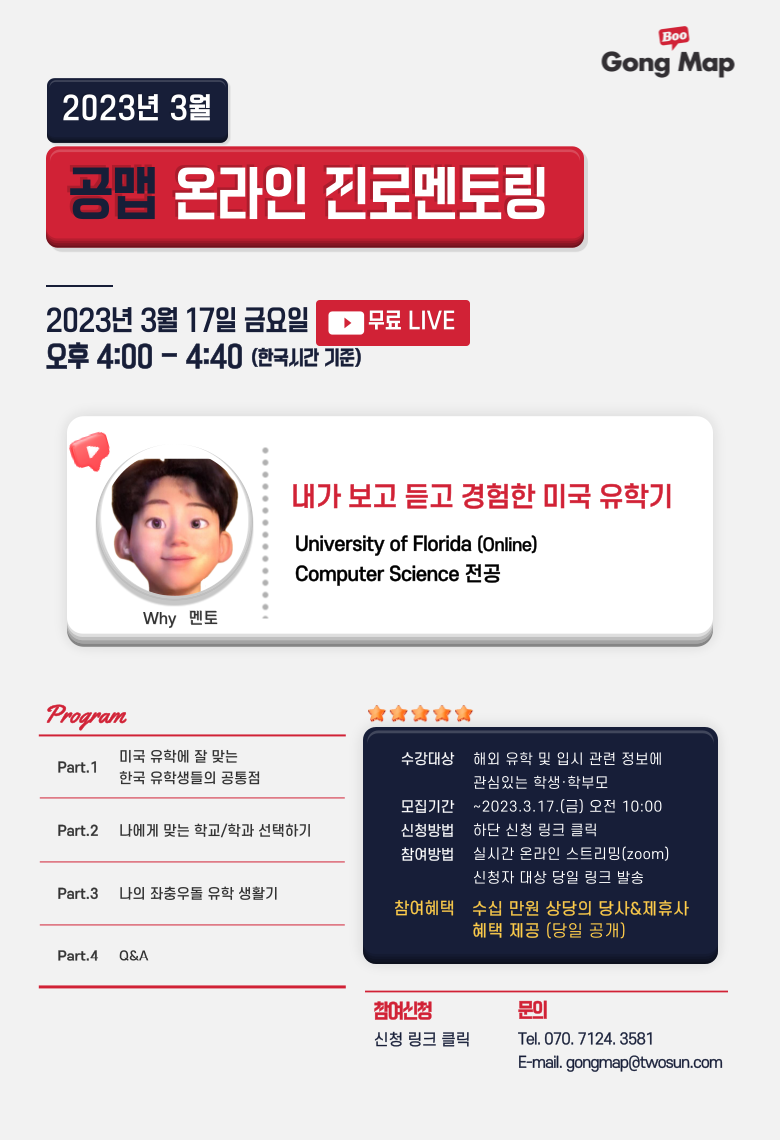 공맵 온라인 진로멘토링은 국내외 유학 선배들의 진로·진학·유학 경험을 나누기 위해 매주 온라인(zoom)을 통해 무료 라이브로 개최됩니다. 진행일정 및 신청은 공맵 홈페이지 > 공지사항에서 확인하실 수 있습니다. 유학을 준비 중인 학생 및 학부모님들의 많은 관심과 참여 부탁드립니다.** 진행일시│2023.3.17.(금) 오후 4:00-4:40 (한국시간 기준) 신청기간│\~23.3.17.(금) 오전 10:00 참가방법│실시간 온라인 스트리밍 (zoom) 대 상│해외 유학 및 입시 관련 정보에 관심있는 학생·학부모 비 용│전액무료 / 선착순 참여혜택│수십 만원 상당의 당사&제휴사 혜택 제공(당일 공개) 신청방법│하단 신청 링크 클릭 관련문의│T. 070-7124-3581 / E. gongmap@twosun.com