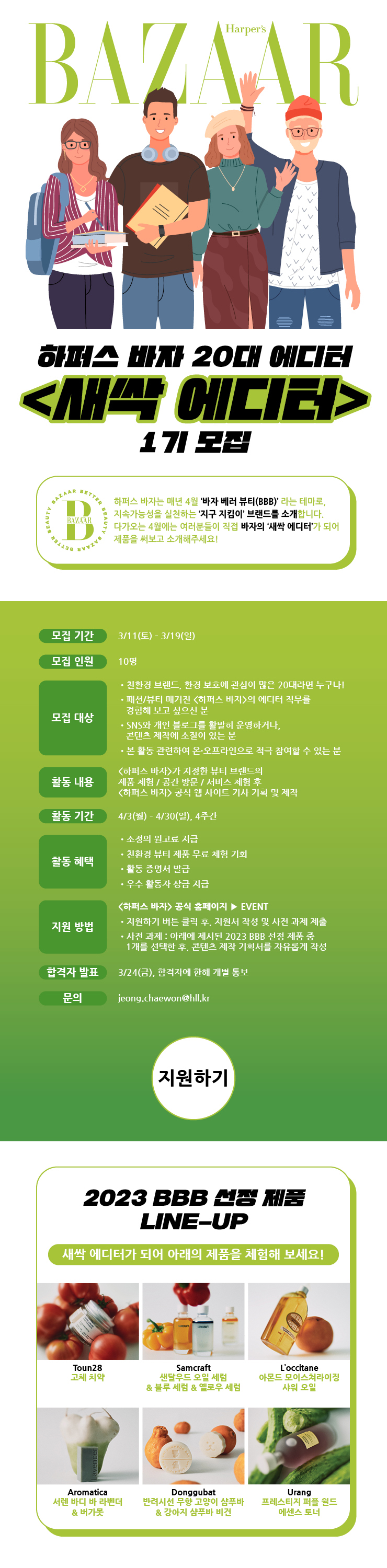 ○ 주최사 / 활동명 하퍼스 바자 / 새싹 에디터 ○ 활동내용 <하퍼스 바자>가 지정한 뷰티 브랜드의 제품 체험 / 공간 방문 / 서비스 체험 후 <하퍼스 바자> 공식 웹 사이트 기사 기획 및 제작 ○ 모집 기간 3/11(토) – 3/19(일) ○ 합격자 발표 3/24(금), 합격자에 한해 개별 통보 ○ 모집 인원 10명 ○ 모집 대상(+졸업생 가능여부) - 친환경 브랜드\, 환경 보호에 관심이 많은 20대라면 누구나! - 패션/뷰티 매거진 <하퍼스 바자>의 에디터 직무를 경험해 보고 싶으신 분 - SNS와 개인 블로그를 활발히 운영하거나\, 콘텐츠 제작에 소질이 있는 분 - 본 활동 관련하여 온〮오프라인으로 적극 참여할 수 있는 분 ○ 활동 기간 4/3(월) – 4/30(일), 4주간 ○ 활동 혜택 - 소정의 원고료 지급 - 친환경 뷰티 제품 무료 체험 기회 - 활동 증명서 발급 - 우수 활동자 상금 지급 ○ 지원 방법 <하퍼스 바자> 공식 홈페이지 ▶ EVENT - 모집 기간 내 구글폼을 통해 지원서 작성 및 사전 과제 제출 - 사전 과제 : 모집 페이지 내 제시된 2023 BBB 선정 제품 중 1개를 선택한 후, 콘텐츠 제작 기획서를 자유롭게 작성 ○ 지원 URL >클릭< ○ 문의 : jeong.chaewon@hll.kr