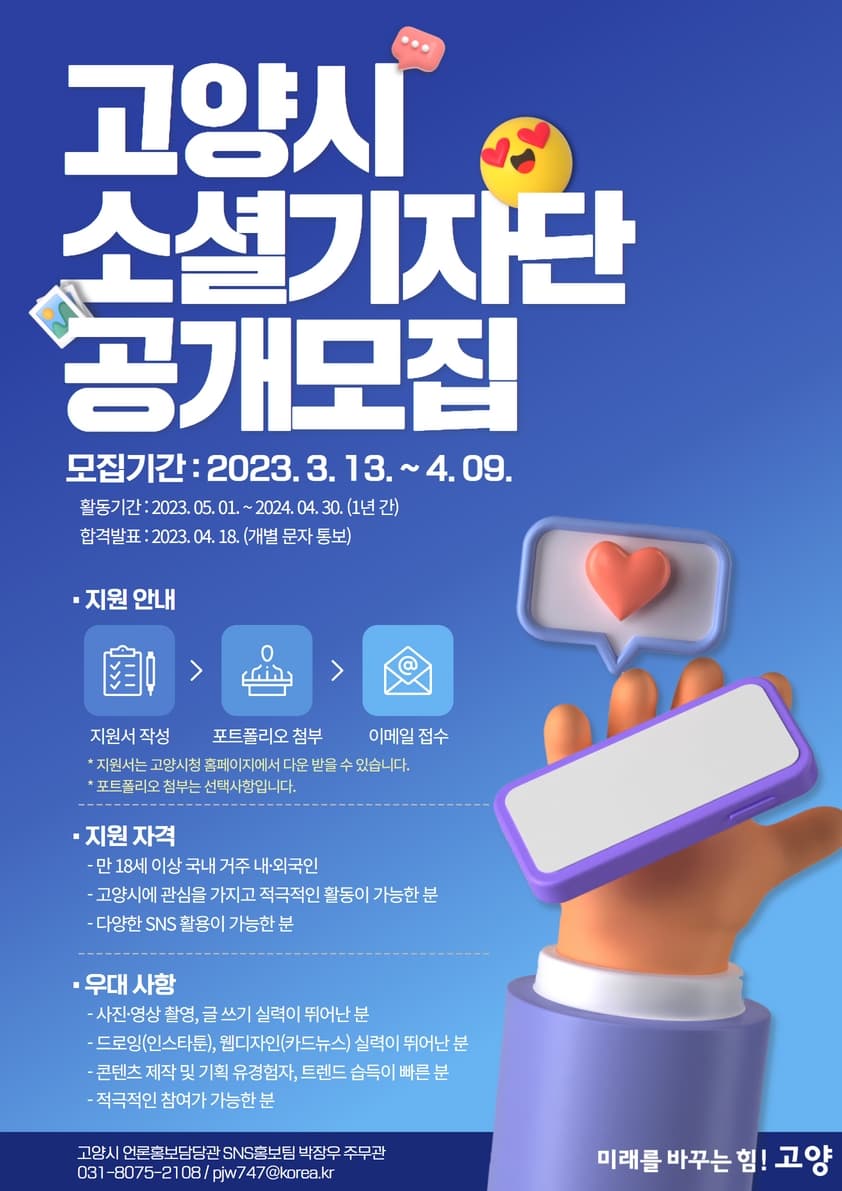 누구보다 ‘고양시에 자신있는 당신’을 기다립니다. 2023년 제6기 고양시 소셜기자단을 모집합니다.