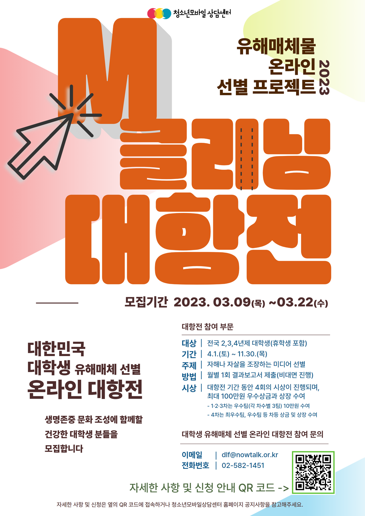[유해매체 선별 프로젝트] 2023 M클리닝 온라인 대항전 (사)마음건강 청소년모바일상담센터는 유해매체 선별 프로젝트_M클리닝 온라인 대항전 실시를 통해 청소년 및 대한민국 국민의 자해·자살을 조장할 수 있는 유해매체물을 선별하고 차단함으로써 생명존중문화 조성에 기여하고, 청소년의 정신건강 및 자살 예방을 도모하고자 합니다. 따라서, 저희 센터의 생명존중 및 자살 예방 프로젝트의 일환인 M클리닝 온라인 대항전에 참여할 건강한 대학생 팀(1인 포함)을 모집하고자 하오니, 많은 분들의 관심과 참여 부탁드립니다. 감사합니다. [모집기간] : 2023. 3. 9.(목) \~ 3. 22.(수) [참가대상] : 전국 대학생 (휴학생 포함) / 1팀당 1인 이상 10인 미만(개인 출전 가능) [참가신청방법] 청소년모바일상담센터 공지사항 ⇨ M클리닝 온라인 대항전 안내 ⇨ 참가신청 링크 접속 후 제출 ⇨ START
