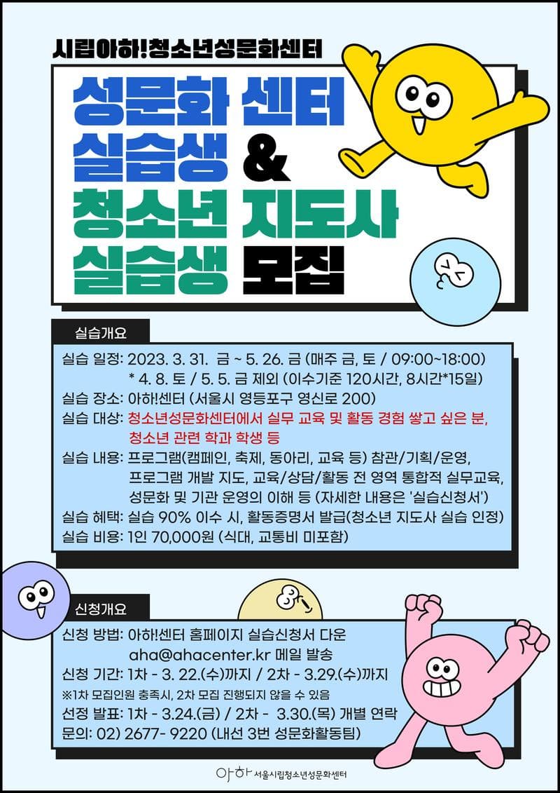 [ 실습 개요 ] 가. 일정: 2023년 3월 31일 \~ 5월 26일(매주 금, 토/09:00\~18:00) 단, 4월 8일, 5월 5일 제외 (이수기준 120시간, 8시간*15일) 나. 장소: 시립아하!청소년성문화센터(서울시 영등포구 영신로 200) 다. 대상: 청소년 성문화센터에서의 실무 교육 및 활동 경험을 쌓고 싶은 분, 청소년 관련 학과 학생 라. 내용: 성교육, 축제, 캠페인, 동아리 운영 지원, 프로그램 기획/운영 지도, 교육/상담/활동/행정 통합적 실무교육, 성문화 스터디 마. 신청기간: 1차 – 3월 22일(수)까지 / 2차 – 3월 29일(수)까지 (※1차 모집 인원 충족 시, 2차 모집은 진행되지 않을 수 있습니다.) 바. 신청비용: 1인 70,000원(식대, 교통비 미포함) 사. 신청방법: https://bit.ly/ahatraining 링크로 접속 ->신청서 다운로드 및 작성 후 aha@ahacenter.kr로 이메일 발송 아. 선정결과: 1차 – 3월 24일(금) / 2차 – 3월 30일(목) 개별문자 안내 자. 문의: 성문화활동팀 (02-2677-9220 내선 3번)