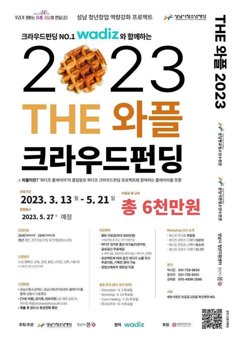 (이전 청년자립프로젝트[뻔FUN한펀딩] 사업) 2023년 성남시청소년재단과 성남시청년지원센터 청년이봄에서 대한민국 NO.1 크라우드펀딩 플랫폼 WADIZ(와디즈)와 함께 ❶ 창업아이템 아이디에이션부터 ❷ 기금마련을 위한 스토리 기획, 펀딩부스팅 등 ❸ 창업 역량강화는 물론, 창업 실현 가능성 진단(테스트 베드)과 ❹ 창업시장 진출을 위한 A to Z를 함께 펼처볼 청년 창업팀을 모집합니다!! 평소에 해보고 싶었거나 고민하던 아이디어, 사회 가치실현 프로젝트, 창업 아이템 등을 실현해보고 싶은 청년 여러분의 많은 신청 부탁드리며, 자세한 사항은 아래의 글과 모집 공고문을 참고하시기 바랍니다:D ㅡㅡㅡㅡㅡㅡㅡㅡㅡㅡㅡㅡㅡㅡㅡㅡㅡㅡㅡㅡㅡㅡㅡㅡㅡㅡㅡㅡㅡㅡㅡㅡㅡㅡㅡㅡㅡㅡㅡㅡㅡㅡㅡ ※ 크라우드펀딩이란? 크라우드펀딩(Crowd Funding) = Crowd(군중) + Funding(자금조달)의 합성어 ㅡㅡㅡㅡㅡㅡㅡㅡㅡㅡㅡㅡㅡㅡㅡㅡㅡㅡㅡㅡㅡㅡㅡㅡㅡㅡㅡㅡㅡㅡㅡㅡㅡㅡㅡㅡㅡㅡㅡㅡㅡㅡㅡ ※ 와디즈 크라우드펀딩이란? "새로운 길을 도전하는 창업, 스타트업을 시작하는 메이커가 투자를 받을 수 있는 프로젝트형 펀딩과 개인이 사회 가치실현을 위한 후원을 받는 후원형 펀딩으로 이루어져 있습니다." (해당 사업과 관련이 없는 투자형 펀딩은 설명에서 제외하였습니다.) ㅡㅡㅡㅡㅡㅡㅡㅡㅡㅡㅡㅡㅡㅡㅡㅡㅡㅡㅡㅡㅡㅡㅡㅡㅡㅡㅡㅡㅡㅡㅡㅡㅡㅡㅡㅡㅡㅡㅡㅡㅡㅡㅡ ┌ ─ ─ ─ ─ ─ ─ ─ ─ ─ ─ ┐ ★ THE 와플 1기기 모집 안내 ★ └ ─ ─ ─ ─ ─ ─ ─ ─ ─ ─ ┘ ○ 활동기간 : 6월 \~ 12월 ○ 활동장소 : 성남시청소년재단 내/외부 활동지 및 온라인(ZOOM, YOUTUBE) ○ 모집기간 : 2022. 03. 13.(월) \~ 2023. 05. 21.(일) ○ 모집대상 : 20세(2004년생) \~ 29세(1995년생) 청년 개인 또는 팀 ○ 모집인원 : 20팀 내외 ○ 신청방법 : 해당 공고문 확인 ▶ 신청파일 다운로드 및 작성 후, ▶ 파일명을 '[THE 와플]_팀명_대표자명'으로 설정 후, ▶ 이메일 제출(sncrowd@snyouth.or.kr) 제출 ※ 신청서 이메일 접수 후, 유선전화를 통한 확인을 꼭 부탁드립니다! ○ 면접예정일 : 2023. 05. 27.(토) ※ 면접일은 내부사정에 따라 변동될 수 있는 예정일임을 안내드립니다. ● 지원혜택 ❶ 활동 지원금(최대 300만원) *현금지급 후 정산, 일부 현물지원 ❷ 와디즈 임직원 출강 워크숍&타운미팅 ❸ 공유공간 무료제공 *세미나실, 공유주방, 메이커실, 스튜디오, 공연장 등 ❹ 프로젝트에 따라 공간 와디즈 쇼룸 전시 무료지원, 기획전 참여 가능 ❺ 창업선배와의 멘토링 지원 ● 활동 안내(필수 참석 일정) ❶ Orientation : 6월 3일(토요일) ❷ Workshop : 6월 24일(토요일) ❸ Town meeting : 7월 29일(토요일) ❹ 결과공유회 : 12월 9일(토요일) ※ 필수 참석 일정의 경우, 운영상황에 따라 협의 하에 일정이 변동될 수 있습니다. ○ 문의방법 : 분당판교청소년수련관 박시진(031-729-9634) 분당서현청소년수련관 장진미(031-729-9631) 성남시청년지원센터 김태중(070-4908-2090) ※ 모집 공고문을 꼭 정독하여주세요! 감사합니다:D