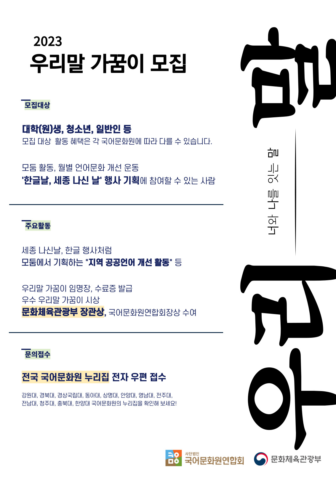 동아대 국어문화원에서 문화체육관광부, 사단법인 국어문화원연합회와 함께 2023년 부산 지역 우리말 가꿈이를 모집합니다.