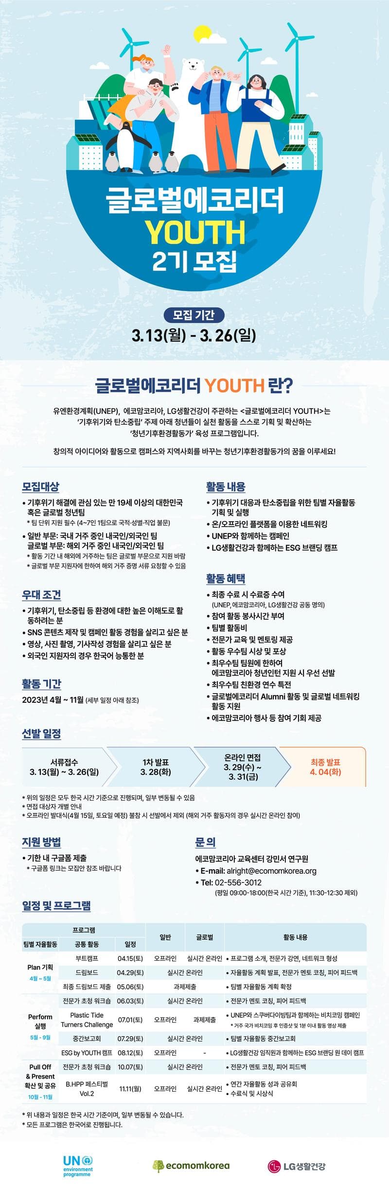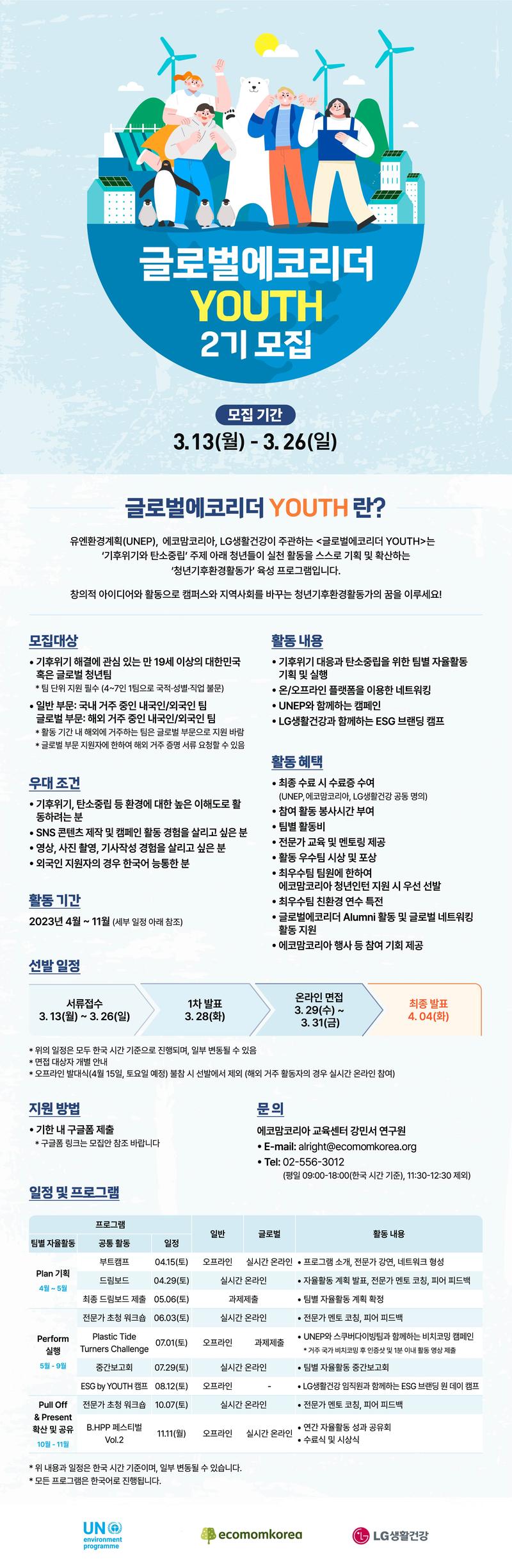 유엔환경계획(UNEP), 에코맘코리아, LG생활건강이 주관하는 <글로벌에코리더 YOUTH>는 ‘기후위기와 탄소중립’ 주제 아래 청년들이 실천 활동을 스스로 기획 및 확산하는 ‘청년기후환경활동가’ 육성 프로그램입니다. 탄소중립을 위한 창의적 아이디어를 폭넓은 시야로 바라보고 확산할 수 있도록 전문가 멘토링, 활동비, 네트워킹 플랫폼, 캠페인, 성과공유회, ESG 캠프 등 다양한 활동 기회를 제공합니다. 캠퍼스와 지역사회에서 체인지 메이커로 활동하고 싶은 에코리더들의 도전을 환영합니다.