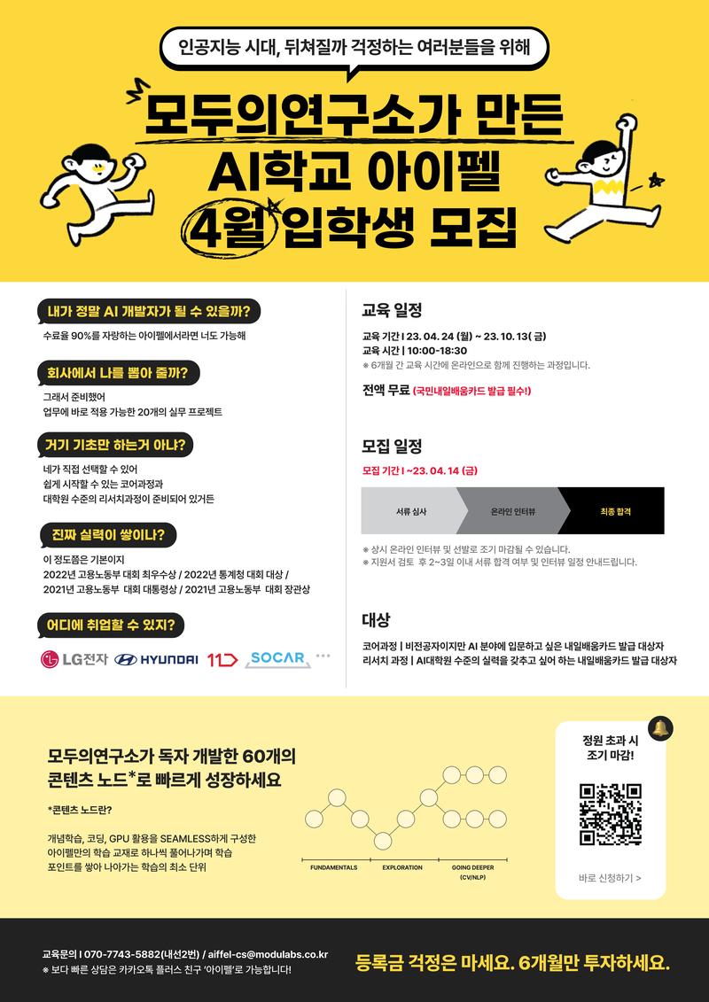 AI 학교 아이펠(AIFFEL), 뭐가 특별할까요? [1] 20여 개의 프로젝트로 배우며 실무 능력 UP UP↗ [2] 카카오, LG 전자 등 전문 크리에이터들이 만든 스토리 기반의 재밌는 콘텐츠 학습 [3] 복잡한 리눅스 설치 없이 바로 코딩 실습 가능한 교육 플랫폼 제공'