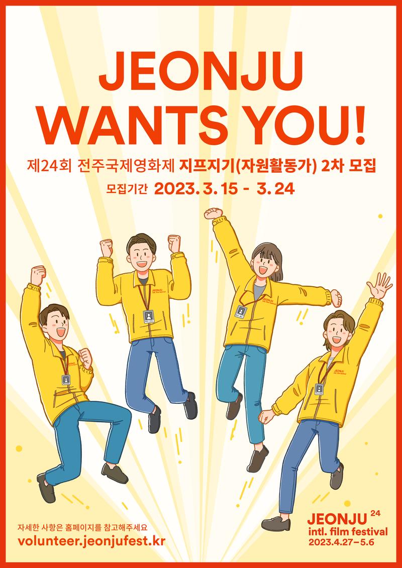 전주국제영화제 지프지기로 참여할 마지막 기회! 당신의 봄을 전주국제영화제와 함께! ■모집 일정 - 모집기간: 2023년 3월 15일(수) \~ 3월 24일(금) 24시 - 1차 서류 합격자 발표: 3월 31일(금) 16시 - 2차 면접 심사: 4월 4일(화) \~ 7일(금) * 면접은 오프라인(대면)으로 진행합니다. * (전북 외 지역 거주자인 경우) 면접 교통비를 지원합니다. - 최종 합격자 발표: 4월 12일(수) 16시 * 모집과 관련된 일정은 변동될 수 있습니다. ■모집 대상 - 대한민국 성인 누구나(2004년 12월 31일생까지 지원 가능) - 한국어로 의사소통할 수 있는 국내 거주 외국인 - 영화제에서 진행하는 교육 프로그램 참여 및 확정된 근무 형태에 따른 활동기간 동안 적극적인 참여가 가능한 사람 - (전북 외 지역 및 해외거주자인 경우) 활동에 따른 체재비 등에 대해 본인 부담이 가능한 사람 ■ 지원 방법 - 전주국제영화제 지프지기 사이트를 통한 온라인 지원만 가능합니다. - 지정된 기재 사항을 성실하고 정확하게 작성합니다. - 본인임을 확인할 수 있는 사진을 필수로 첨부해야 합니다. - (1차 서류 합격자인 경우) 지원 시 기재했던 자격증, 어학 관련 증명서 등의 사본을 별도 요청 시 제출합니다. ■ 선발 기준 - 지원 분야별로 경쟁 선발을 원칙으로 합니다. - 지원서 작성이 미비하거나 기재 사항이 사실이 아닌 경우 1차 서류심사에서 우선으로 제외합니다. - 2차 면접 심사 불참 시에는 자동 탈락 처리됩니다. - 심사 과정에서 지원 분야가 아닌 분야로 선발될 수 있습니다. ■ 활동기간 및 교육일정 - 활동기간: 2023년 4월 27일(목) \~ 5월 6일(토), 10일간 * 파트(팀)에 따라 활동기간은 다를 수 있으며, 사전근무가 필요할 수 있습니다. * 2차(부활) 모집은 일부 파트에 한하여 선발합니다. - 교육일정 ◾공식 교육 - 오리엔테이션: 2023년 4월 15일(토) 10:00 - 전체교육: 2023년 4월 15일(토) 13:30 - 발대식: 2023년 4월 22일(토) - 해단식: 2023년 5월 7일(일) ◾세부 교육: 2023년 4월 12일(수) \~ 4월 26일(수) * 세부 교육은 파트(팀)에 따라 일정이 다르며, 1회에서 3회의 교육을 진행합니다. * 공식 교육 불참 및 세부 교육을 2회 이상 불참할 시 활동 중단 고려의 사유가 됩니다. * 교육과 관련된 일정은 변경될 수 있습니다. ■ 활동 혜택 - 유니폼(점퍼 1종, 티셔츠 2종) 및 배지(ID카드) 지급 - 소정의 활동비(식비, 대중교통비) 제공 - 간식과 음료 제공 - 참여 증서(활동인증서) 및 기념 앨범 지급 - 영화제 기념품 제공 - 자원봉사 활동시간으로 인정(자원봉사포털 ‘1365’ 가입 필수) - (전북 외 지역 거주자인 경우) 공식 교육 및 세부 교육 참여(3회까지) 시 왕복 교통비(우등버스, 무궁화호 기준) 제공 - 우수 지프지기를 선정하여 상장과 상품 수여 - 향후 영화제 영화 관람 시 할인혜택 제공 - 근무 종료 후 영화관람 혜택 제공 * 상기 내용은 변경될 수 있습니다. 자세한 내용은 volunteer.jeonjufest.kr에서 확인 가능합니다. ■문의 이메일 : voluteer@jeonjufest.kr 전화 : 063)280-7902 카카오톡 플러스 친구 : 제24회 전주국제영화제 지프지기 문의 인스타그램 : jeonju_iff_volunteer 많은 관심 부탁드립니다 :)