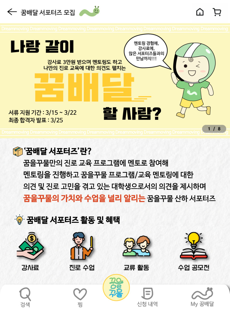 1️⃣ ‘꿈배달 서포터즈’란? 꿈을꾸물만의 진로 교육 프로그램에 멘토로 참여해 멘토링을 진행하고 꿈을꾸물 프로그램/교육 멘토링에 대한 의견 및 진로 고민을 겪고 있는 대학생으로서의 의견을 제시하며 꿈을꾸물의 가치와 수업을 널리 알리는 꿈을꾸물 산하 서포터즈