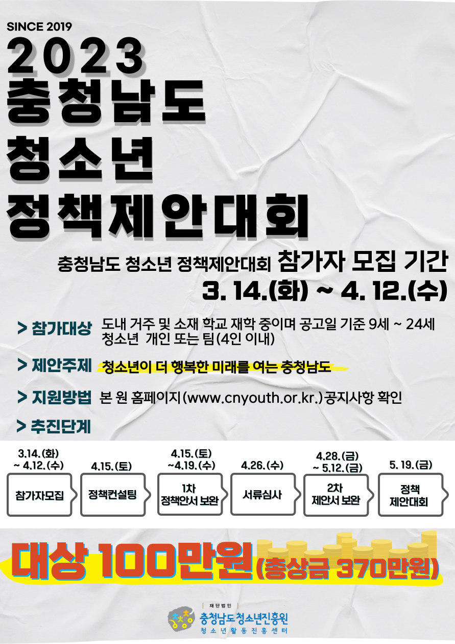 재단법인 충청남도청소년진흥원 활동진흥센터에서는 청소년의 권익을 증진하고 능동적 민주시민으로의 성장을 지원하고자 「2023년 충청남도 청소년정책제안대회」참가자를 모집하오니 도내 청소년들의 많은 참여 바랍니다. 자세한 사항은 붙임 파일을 참고하여 주시기 바랍니다.