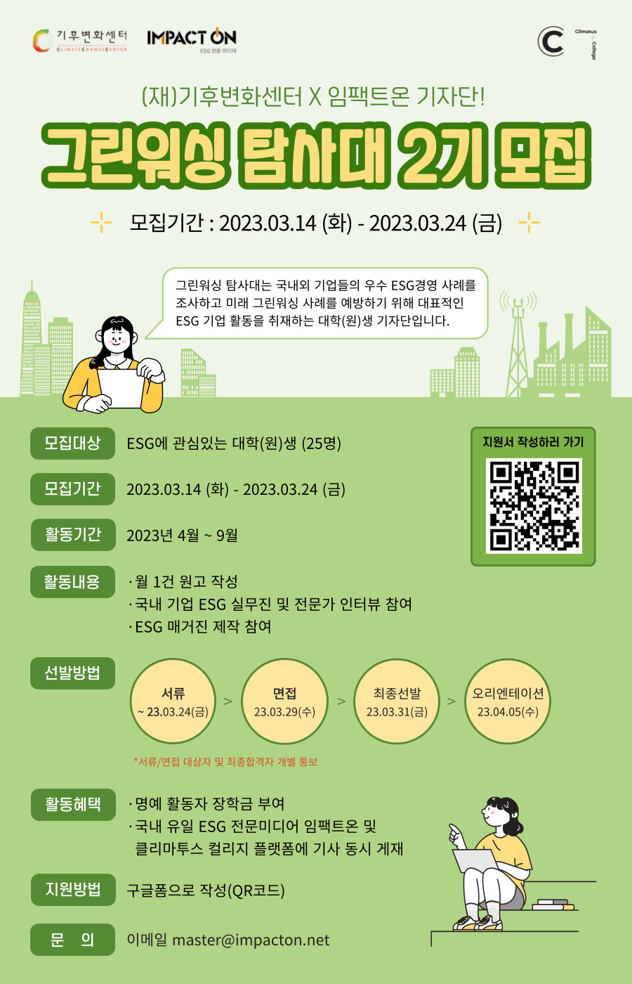 MZ 세대의 기후인식을 높이고 기업 우수 ESG 활동을 널리 알리는 그린워싱* 탐사대 2기를 모집합니다.
