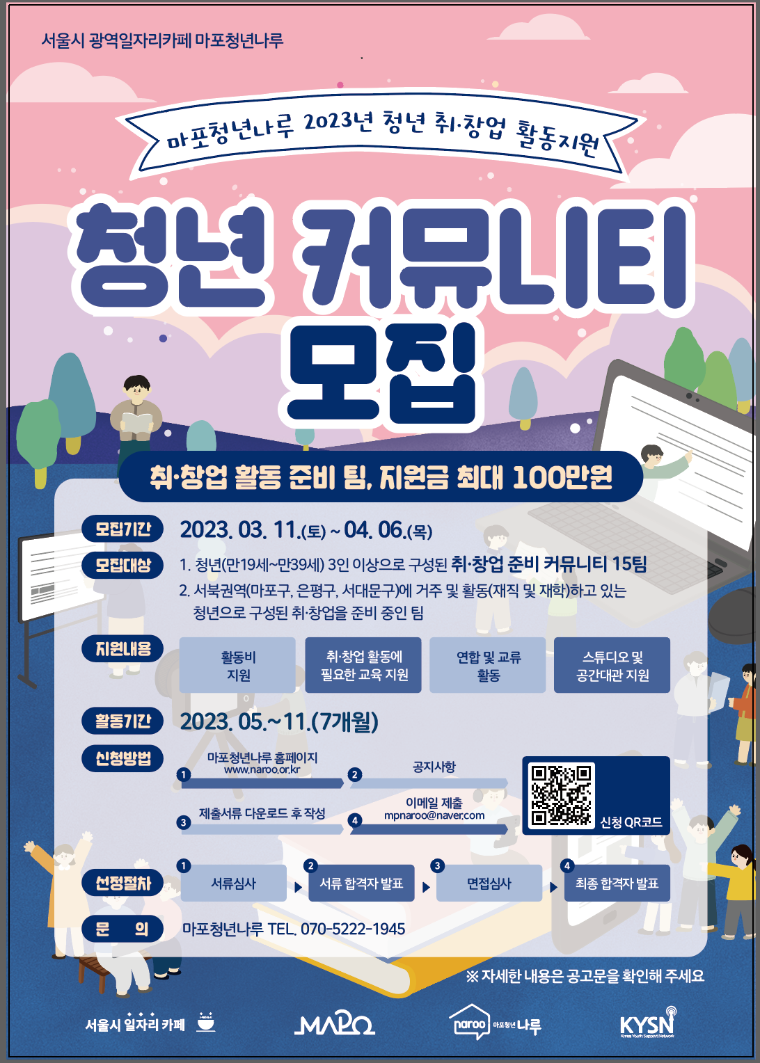 ■ 모집기간 : 2023. 03. 11.(토) \~ 04. 06.(목) ■ 모집대상 : 1. 청년(만19세\~만39세) 3명 이상으로 구성된 취·창업 준비 커뮤니티 15팀 2. 서북권역(마포구, 은평구, 서대문구)에서 활동하고 있는 청년으로 구성된 취·창업을 준비 중인 팀 ■ 지원내용 : 활동비 지원, 팀 활동에 필요한 교육 지원 등 ■ 활동기간 : 2023. 05. \~ 11.(7개월) ■ 신청방법 : 마포청년나루 홈페이지 www.naroo.or.k -> 공지사항 -> 제출서류 다운로드 후 작성 -> 이메일 제출(mpnaroo@naver.com) ■ 제출서류 1. 지원 신청서 1부. 2. 활동 계획서 1부. 3. 예산 집행 계획서 1부. 4. 명단 1부. 5. 개인정보 수집 및 이용 동의서 1부. ※ 자세한 사항은 공고문을 확인해 주세요