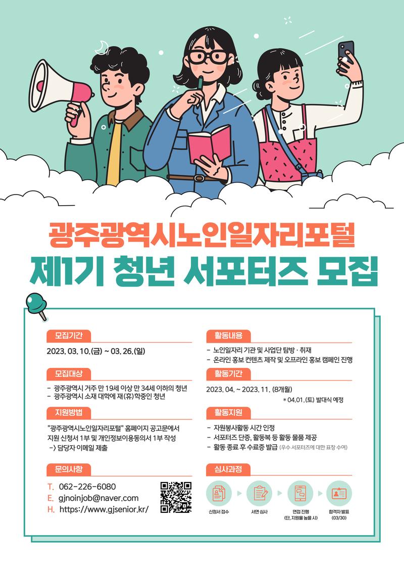 ● 참가 자격 및 모집 대상 - 광주광역시 거주 만 19세 이상 만 34세 이하의 청년 - 광주광역시 소재 대학에 재학중인 노인일자리 사업에 관심이 있는 자 - 광주광역시 내 방문 취재 및 포스팅 활동과 SNS활용이 능숙한 자 - 성실하고 책임감이 있으며 글쓰기를 좋아하고 사진 촬영이 가능한 자 ● 모집 인원 - 약 16명 내외 ● 활동 내용 - 광주광역시노인일자리포털 온·오프라인 홍보활동 - 관내 노인일자리 수행 기관 및 사업단 탐방 - 노인일자리 참여 어르신 취재 및 인터뷰 - 노인일자리포털 관련 사업 온라인 홍보 컨텐츠 제작 - 노인일자리 및 노인일자리포털 관련 오프라인 홍보 캠페인 진행 - 연내 2회 이상 팀 회의 진행 ● 활동 혜택 (특전) - 서포터즈 위촉장 및 수료증 발급 (활동 수료자에 한함) - 서포터즈 활동복 및 서포터즈 단증 지급 - 서포터즈단 간담회, 팀 빌딩 활동 등 (회의비 지원) - 서포터즈 활동에 대한 자원봉사활동 시간 부여 (VMS) - 활동 종료 시, 우수활동 서포터즈에 대한 표창 수여 ● 운영 일정 - 접수 기간 : 03.10.(금) \~ 03.26.(일) - 심사 기간 : 03.27.(월) \~ 03.29.(수) - 결과 발표 : 03.30.(목) - 발대식 : 04.01.(토) 의무 참석 - 활동 기간 : 2023. 04. \~ 2023. 11. (8개월) ● 접수 방법 - 제출 서류 : 청년 서포터즈 지원 신청서 1부 [서식1], 개인정보 수집 동의서 1부 [서식2] - 신청 방법 : 홈페이지에서 서식 다운로드 후 이메일 접수 * (gjnoinjob@naver.com)/지원서 파일명 : 청년서포터즈_이름