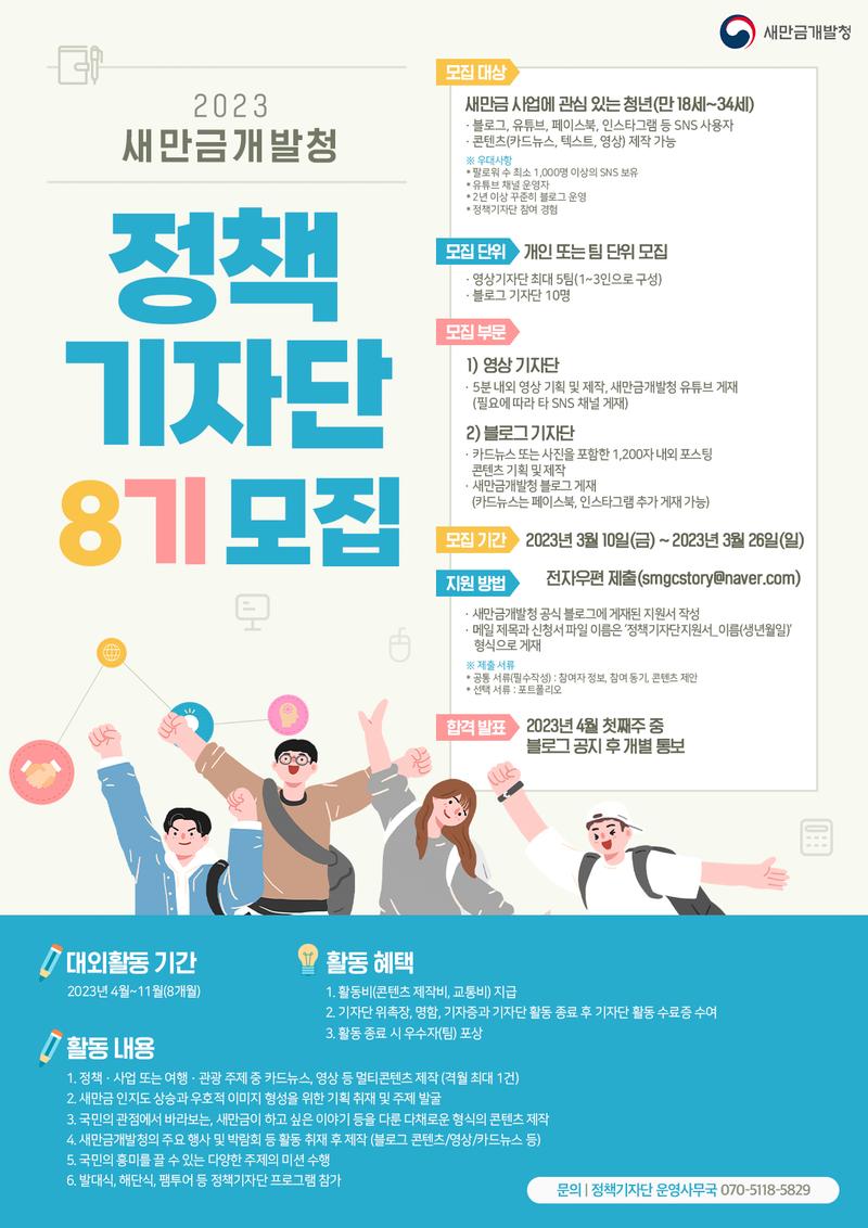 새만금개발청의 주요 사업에 관심이 있고 새만금의 주요 정책과 핵심 사업을 비롯해 새만금의 역사, 문화, 관광 분야의 다양한 이슈를 소개할 2023 새만금개발청 '정책기자단' 8기 모집! 현장감 넘치는 다양한 새만금 콘텐츠로 국민들의 눈높이에 맞추어 소통할 청년 인재들을 모집합니다! 새만금개발청 정책기자단 모집 기간