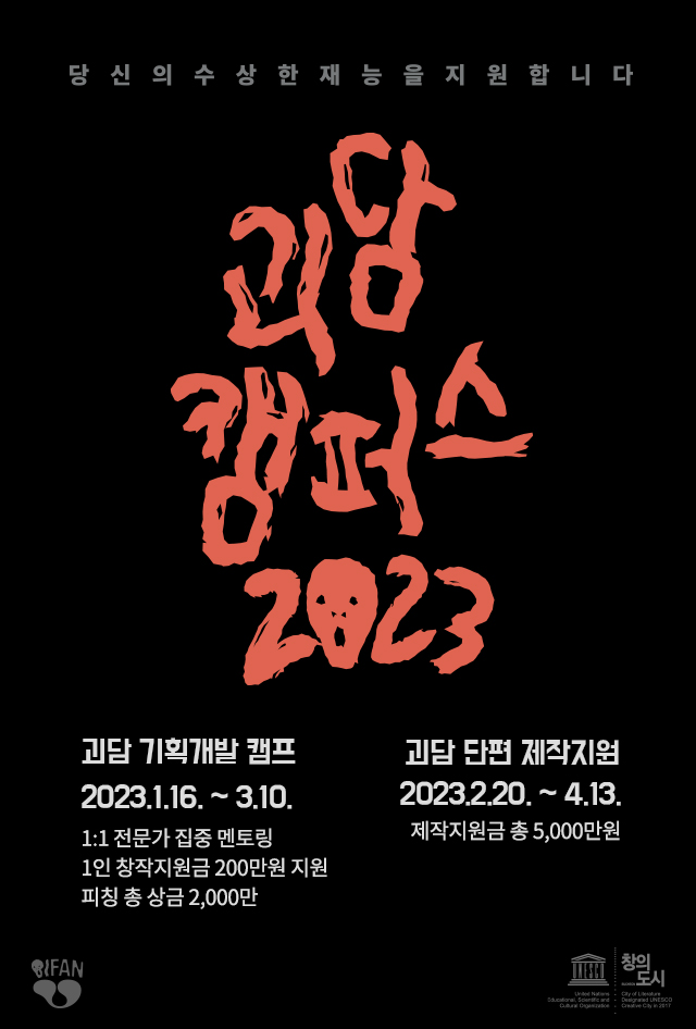 당신의 수상한 재능을 지원합니다! 부천국제판타스틱영화제가 무섭거나 이상한 세상의 모든 이야기인 ‘괴담’을 소재로 ‘괴담 단편 제작지원’ 공모를 진행합니다. ◎ 괴담 단편 제작지원 수상한 작품을 찾습니다! ⊙ 제작지원금 총 5,000만원 지원 ⊙ 작품 모니터링 자문 지원 - 모집대상 : ‘괴담’을 주제로 한 단편영화 - 접수기간 : 2023년 2월 20일(월) \~ 4월 13일(목), **마감일 17시까지 - 면접일정 : 2023년 6월 9일(금) - 선정작 발표 : 2023년 6월 15일(목) * 제작지원 선정작은 2024년 3월까지 제작완료 필수. ※ 상기 일정은 상황에 따라 변경될 수 있습니다. 접수하기 : http://www.bifan.kr/program/project_30.asp** *자세한 사항은 공모 페이지 참고 문의) 부천국제판타스틱영화제 창작지원팀 이메일 contest@bifan.kr 전화 032-327-6313 (내선130)