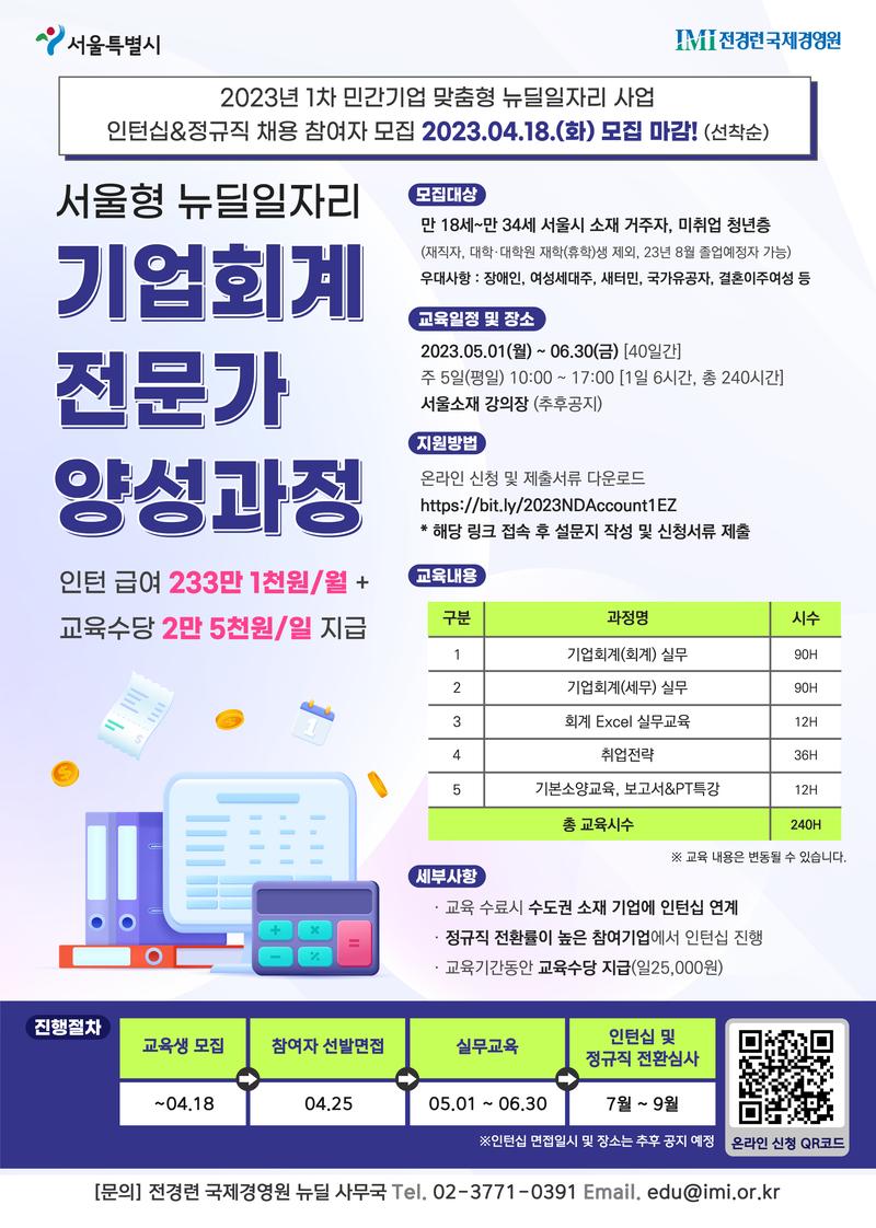 ■ 참여혜택 -1일 25,000원 교육수당 지급 -월 233만 인턴급여 지급 -수도권 소재 기업의 인턴십 연계 -정규직 전환률 높은 참여기업에서 인턴십 진행