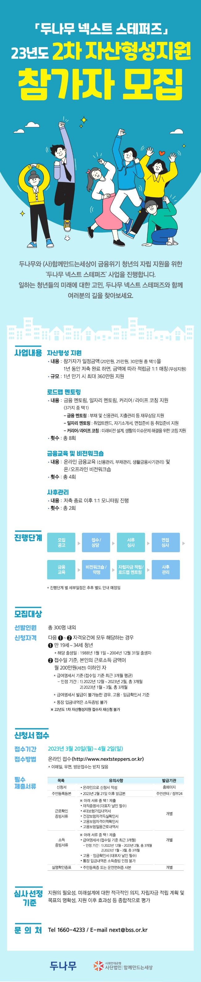 ◆ 지원 방법 온라인 접수 (http://www.nextsteppers.or.kr) ◆ 문의처: ☎ 1660-4233 / 이메일: next@bss.or.kr