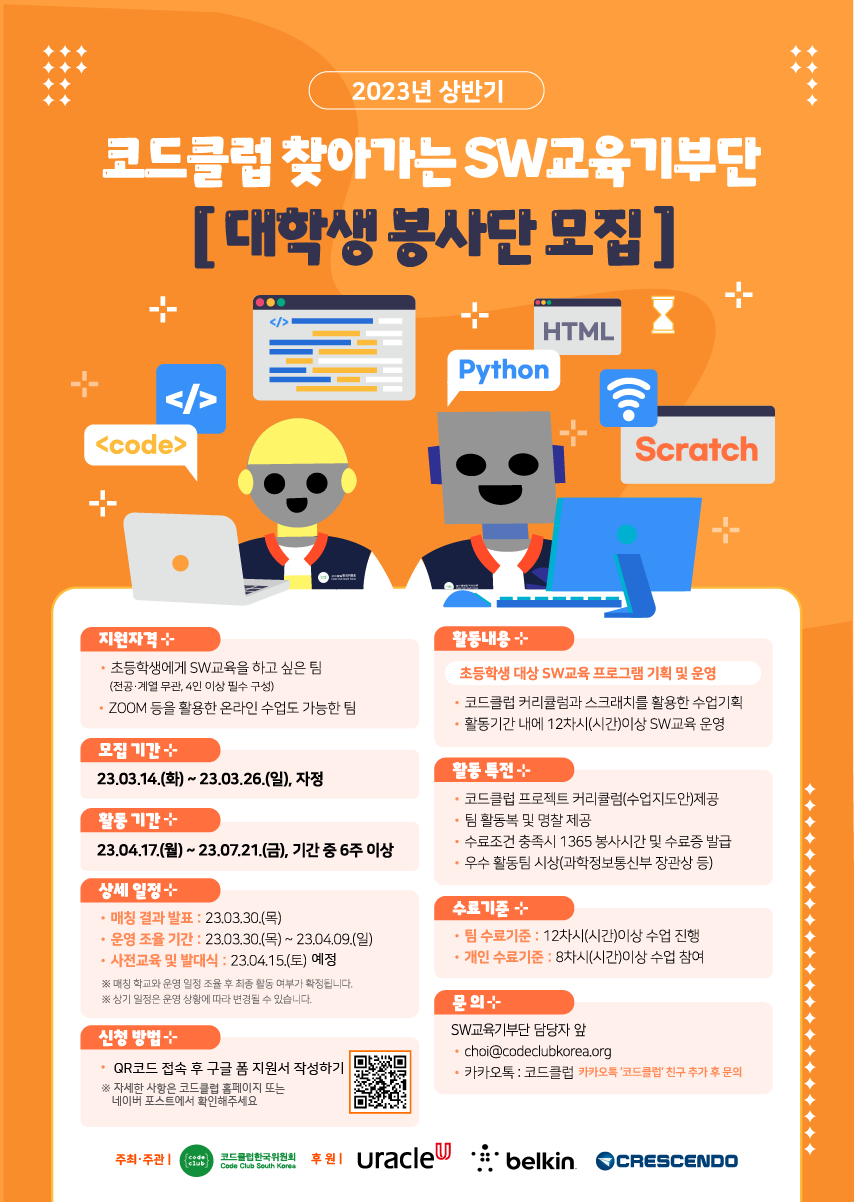 📣"2023 상반기 코드클럽 찾아가는 SW교육기부단을 통해 SW교육 나눔을 실천할 대학생 봉사단을 모집합니다!"📣