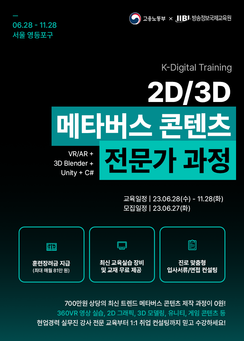 - 700만원 상당의 최신 트렌드 VR/AR 취업과정이 100% 전액무료 - 360VR 영상 실습\, 2D 그래픽\, Blender 3D 모델링/애니메이션\, 유니티 게임 개발 등 - 3가지 실습 프로젝트 및 취업 컨설팅까지! ▶ 무료교육 신청하러 가기