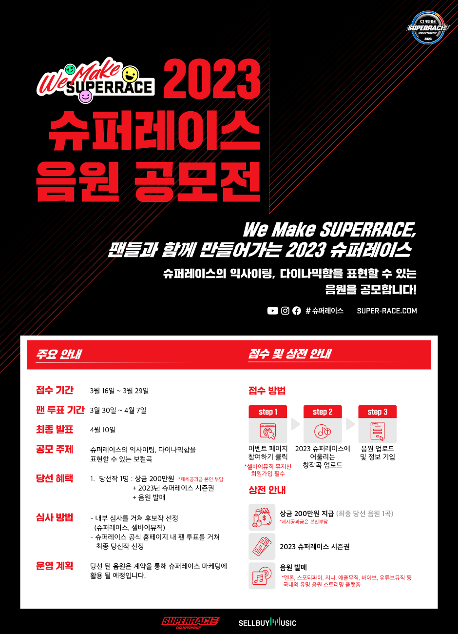 ●시상 내역 당선작 1명 : 상금 200만원 (제세공과금 본인부담) + 2023년 슈퍼레이스 시즌권 + 음원 발매