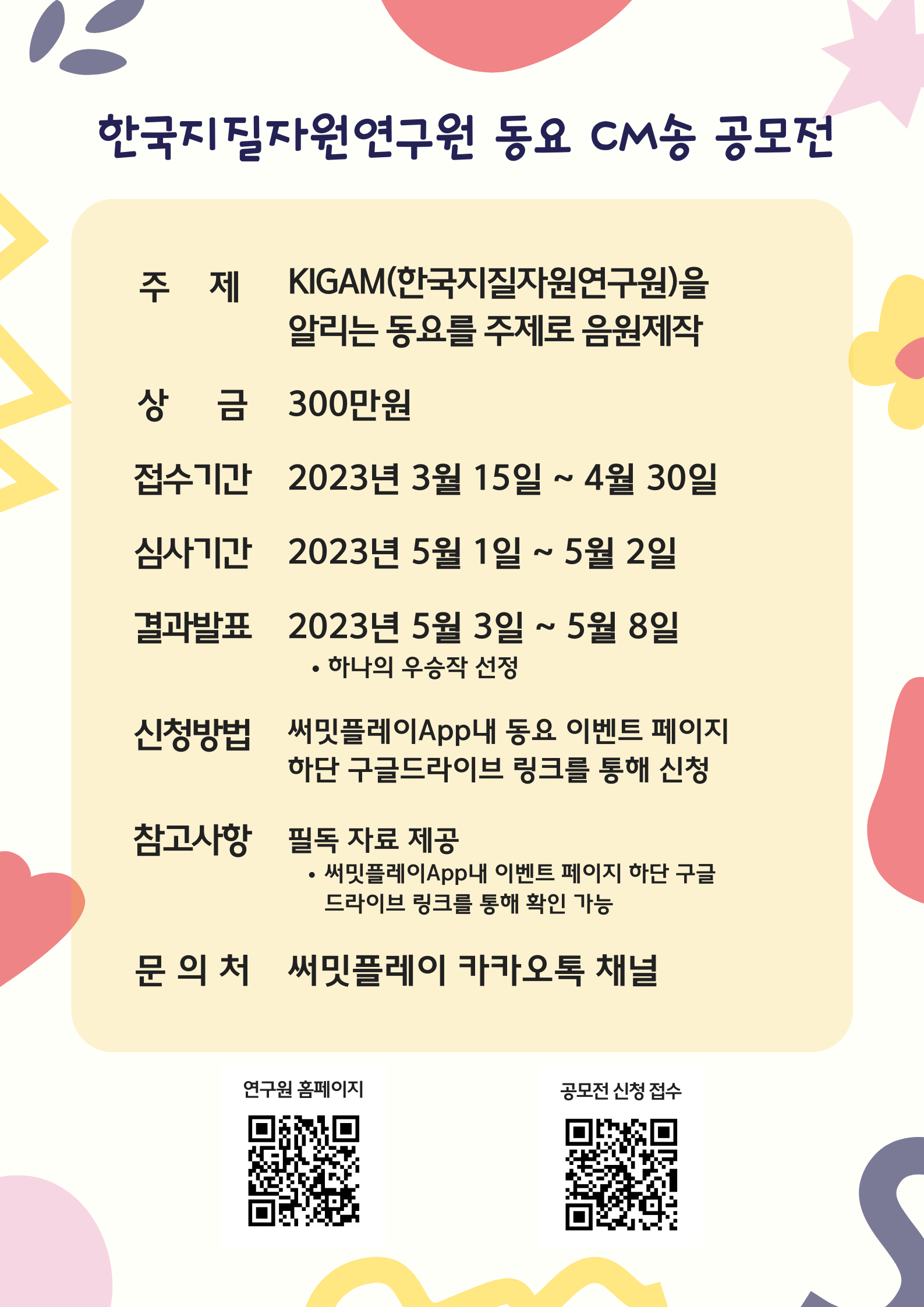 - 필독 자료 접속 경로 : 써밋플레이 App 다운로드 ➡️ 동요 CM송 공모전 이벤트 페이지 ➡️ 페이지 하단 구글드라이브 링크(공모전 신청 링크)로 접속 ➡️ 공모전 신청 폼에 한국지질자원연구원의 소개 및 공모전 레퍼런스 자료가 안내되어 있음